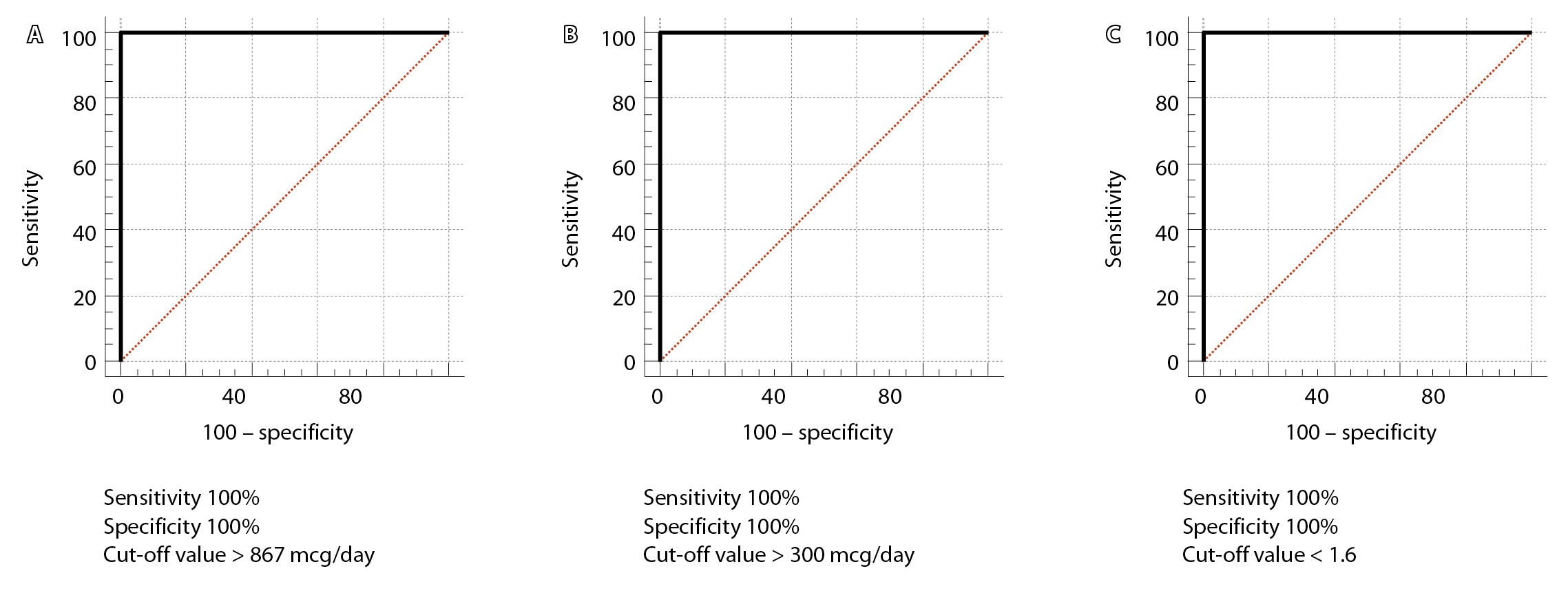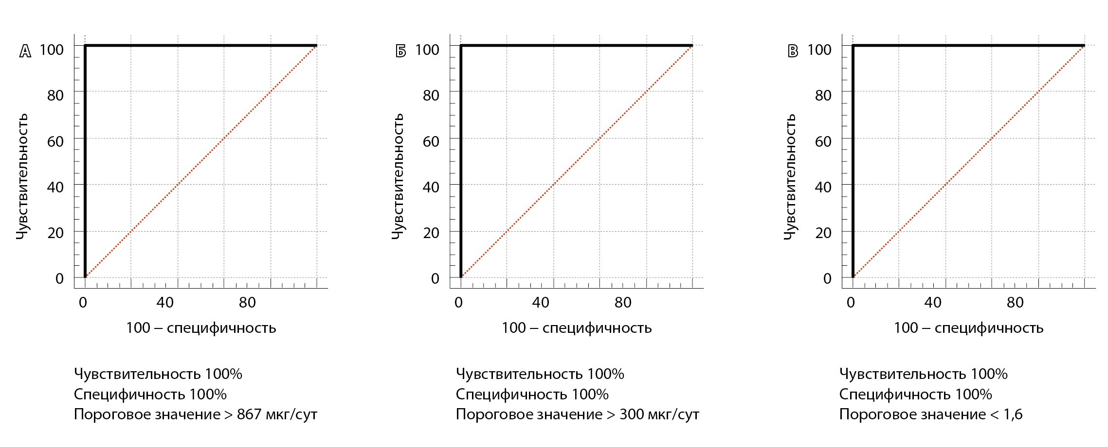 Определены 100% чувствительность и специфичность пороговых значений экскреции с мочой ТНS > 867 мкг/сут, 3β,16,20-dP3 > 300 мкг/сут и соотношения 3α,16,20-dP3/3β,16,20-dP3 < 1,6 для диагностики АКР с IV стадией и признаков метастазов (AUC = 0,99, p < 0,0001) (рис. 5).