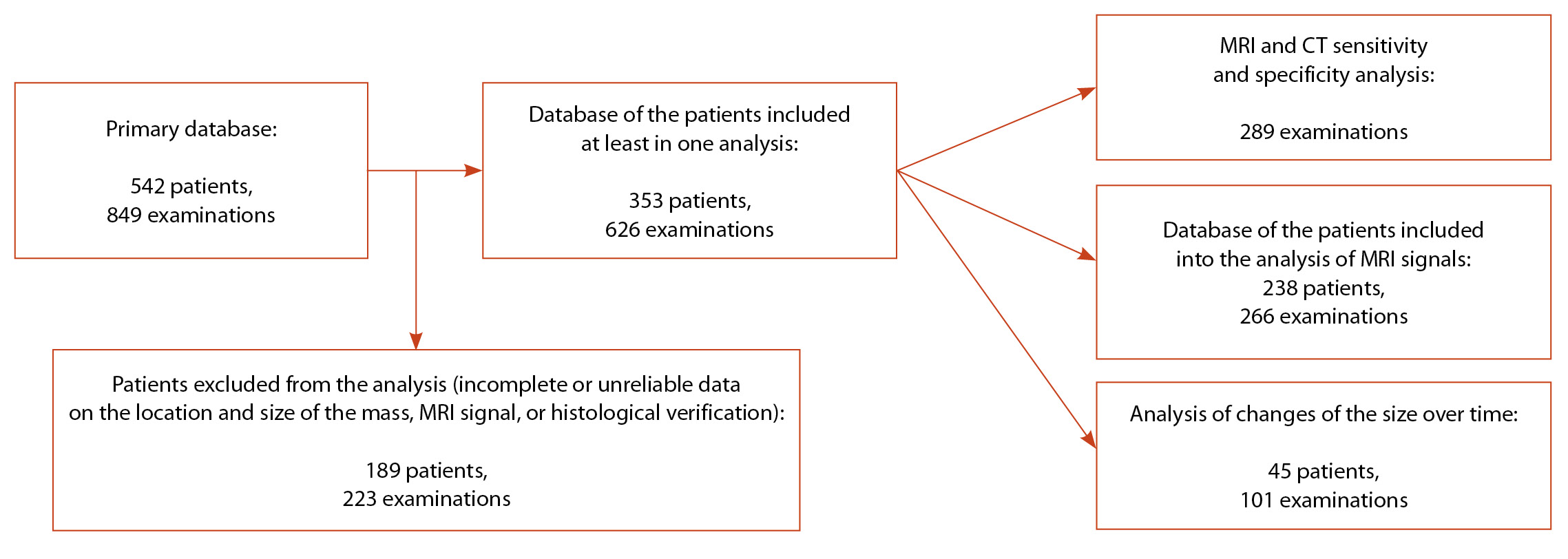 После первичной обработки базы данных из анализа были исключены 189 пациентов (223 исследования), у которых отсутствовало одно из перечисленного: точные данные по локализации, размеру, МР-сигналу или гистологическая верификация. Итого, хотя бы в один из этапов анализа вошли 353 пациента (626 обследований) (рис. 1).