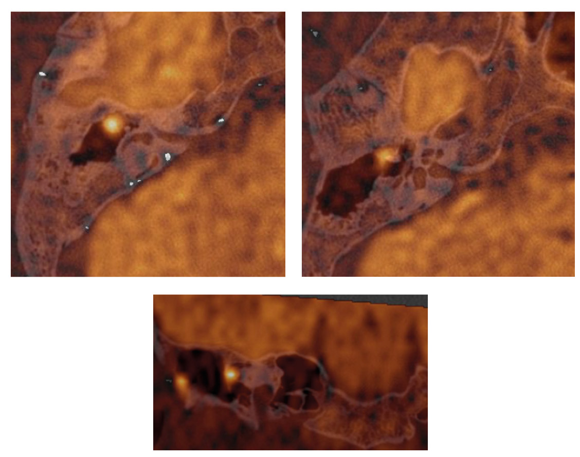 Не было найдено значимых различий между ограничением МР-диффузии в холестеатомах и артефактах, вызванных локальным воспалением, часто в ограниченных ячейках сосцевидного отростка, и в этом контексте возможность слияния изображений приобретает более весомое значение для исключения артефактов вне возможной зоны рецидива и определения точной топической локализации холестеатомы.