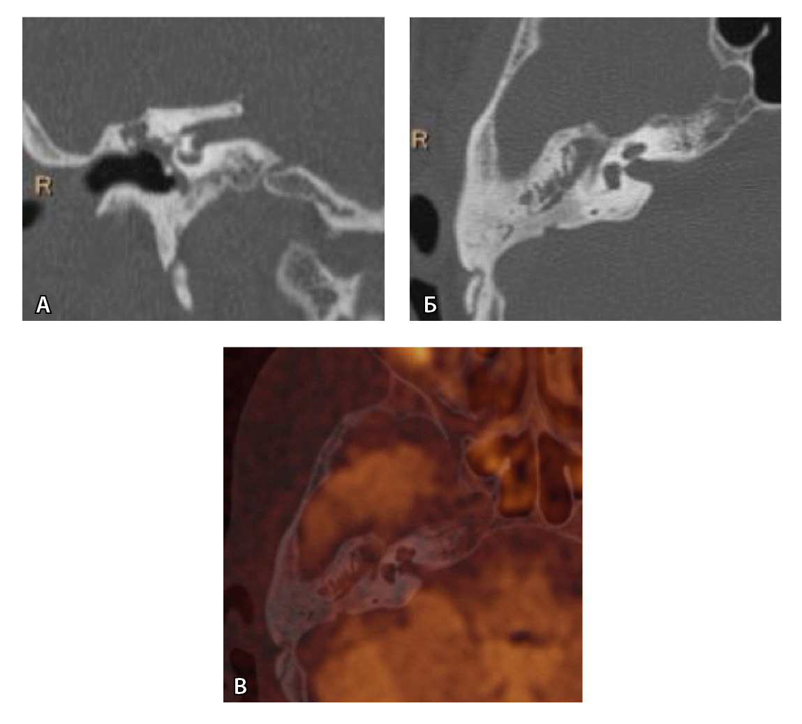 Рис. 4. При компьютерной томографии (КТ) визуализируются признаки хронического гнойного среднего отита справа. Наблюдаются латерализация косточек среднего уха и узурация их по имедиальной поверхности на уровне эпитимпанума (тело наковальни и головка молоточка) – классические КТ-признаки холестеатомы натянутой части барабанной перепонки (А, Б). Однако по данным магнитно-резонансной томографии (В) и в последующем при оперативном лечении холестеатома не подтверждена