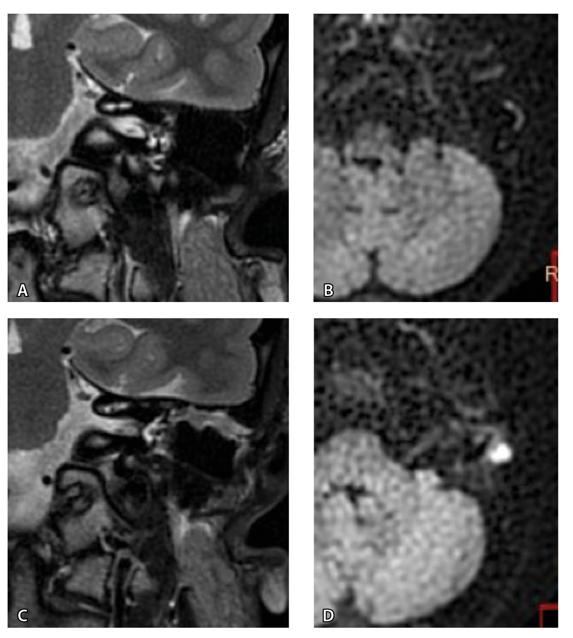 Рис. 5. При первичном послеоперационном исследовании на Т2-взвешенных изображениях во фронтальной плоскости определяется пневматизированная послеоперационная полость (А), без признаков ограничения магнитно-резонансной диффузии (Б). При контрольном исследовании – отрицательная динамика с появлением пристеночных разрастаний вдоль стенок послеоперационной полости (В), ограничивающих магнитно-резонансную диффузию (Г). Данные интерпретированы как рецидив холестеатомы. При оперативном лечении и последующей гистологии – грибковое поражение среднего уха