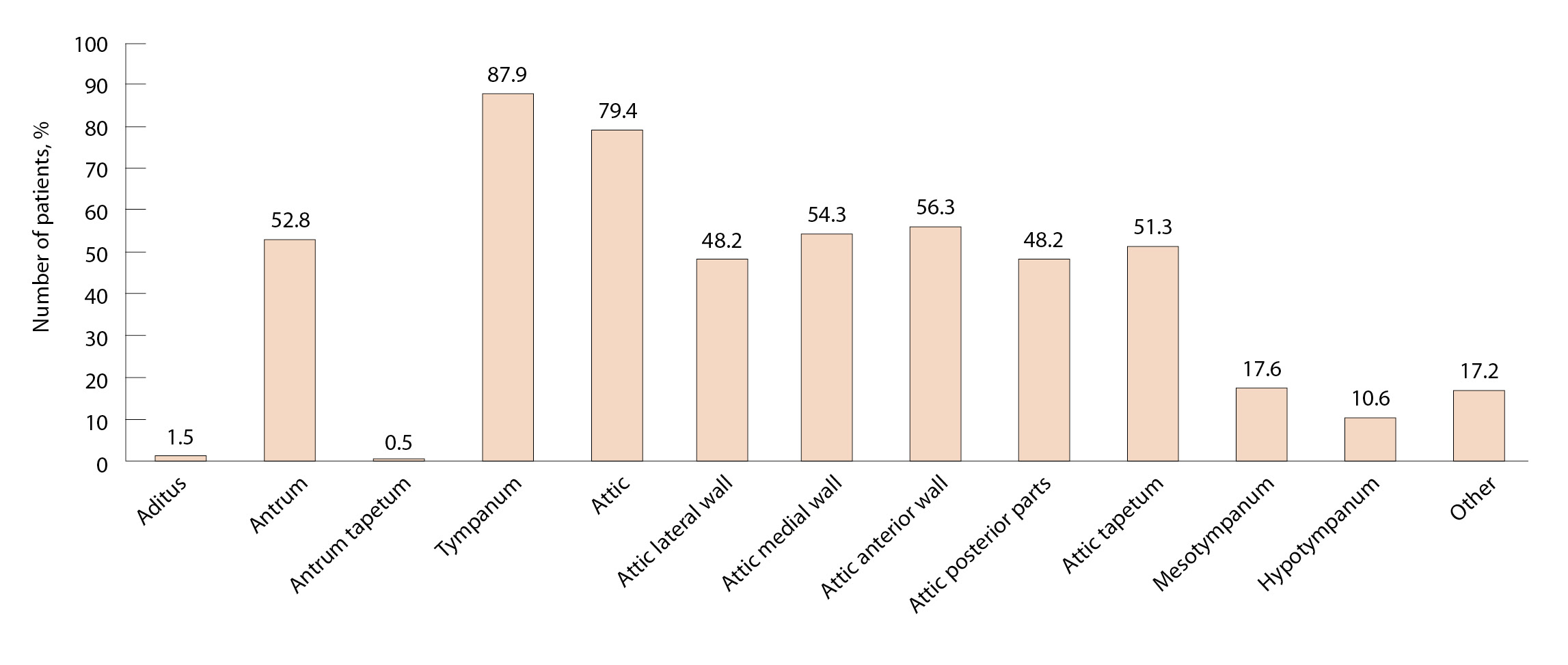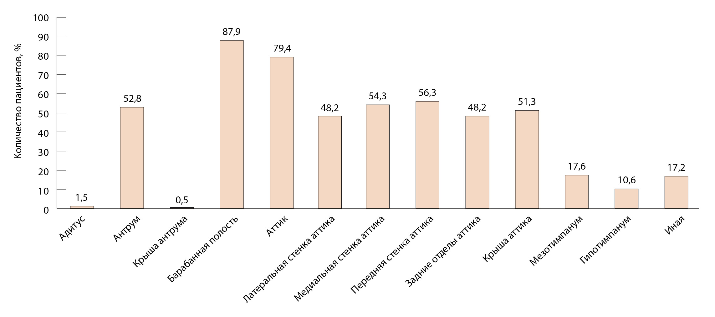 Рис. 6. Частота встречаемости различных локализаций среди морфологически подтвержденных холестеатом
