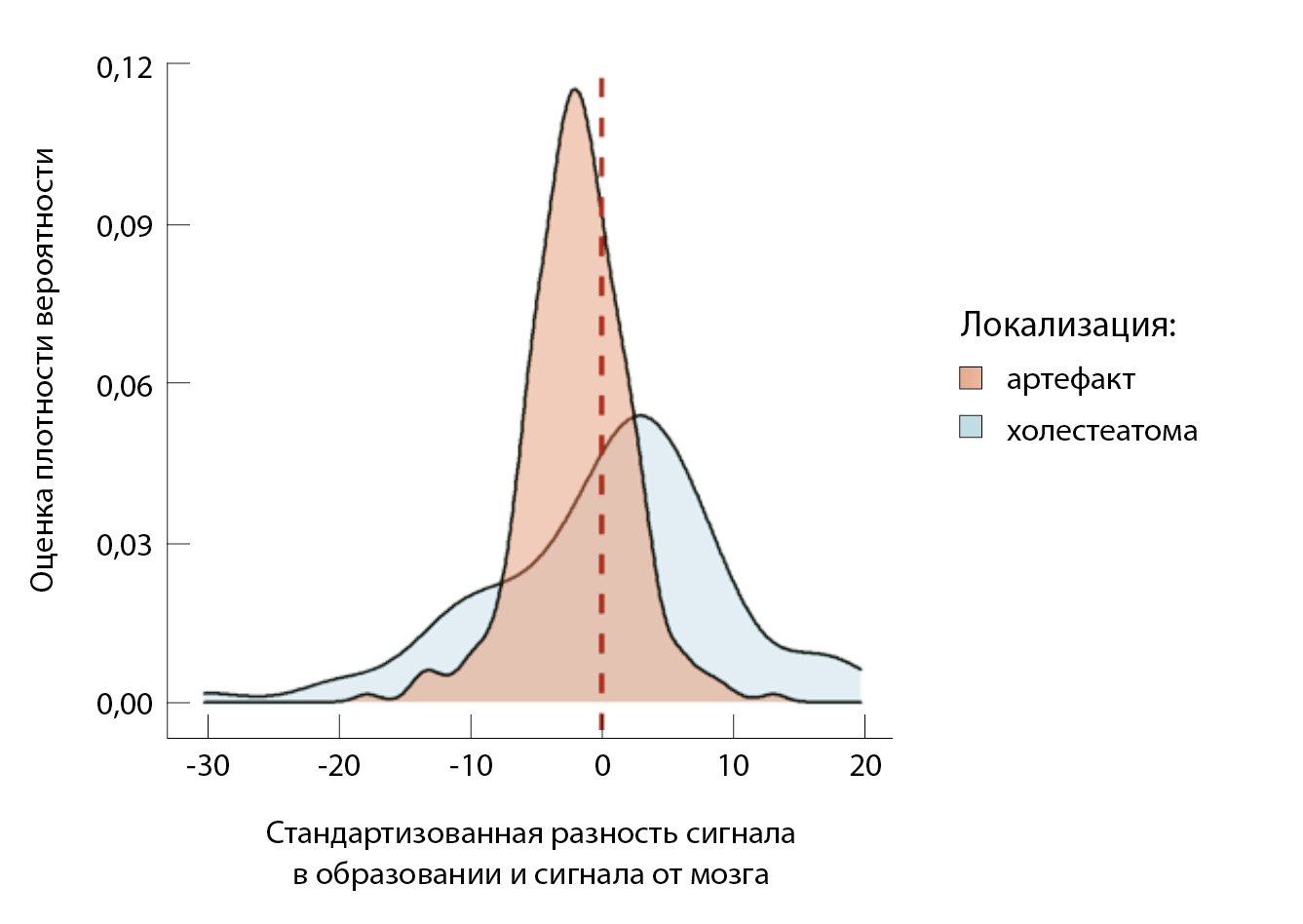 При сравнении сигналов от холестеатомы и очагов ограничения МР-диффузии, обусловленных артефактами или локальным ограниченным воспалительным процессом, в средних значениях сигнал от холестеатомы был ниже, чем от нехолестеатомного процесса (табл. 5). Однако диапазон значений нехолестеатомных процессов, локально ограничивающих МР-диффузию, в том числе включает в себя значение сигнала от холестеатомы, что видно на рис. 7. Поля сигналов от холестеатомы и от не холестеатомы перекрываются в средних значениях.