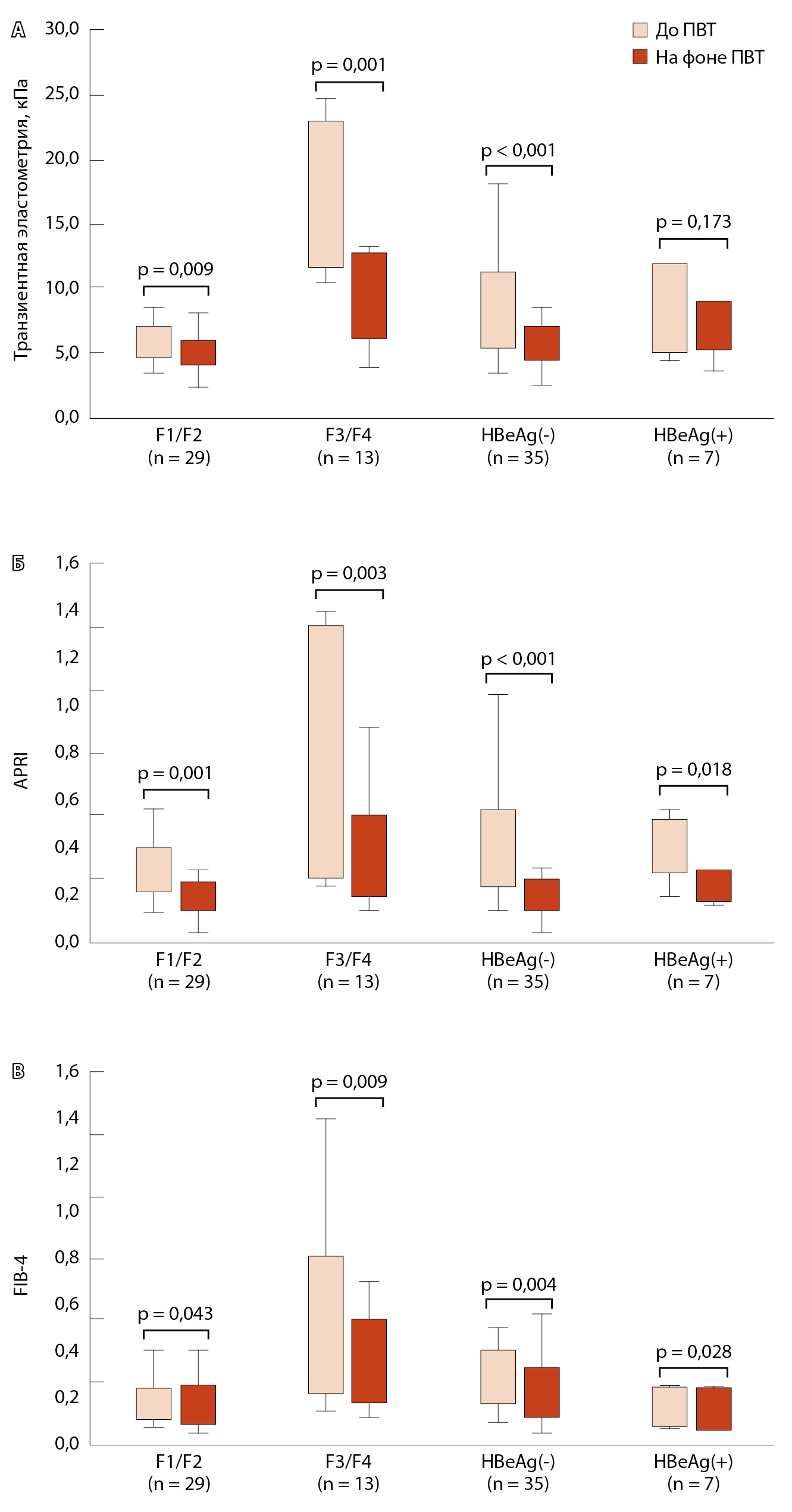 Важной составляющей выступает оценка динамики ФП на фоне ПВТ у пациентов с наличием HВeAg. Вместе с тем провести сравнительную характеристику неинвазивных методов для оценки ФП среди пациентов с ХГВ и различным HBeAg-статусом не представилось возможным в связи с небольшим размером выборки HBeAg(+) больных (n = 7).