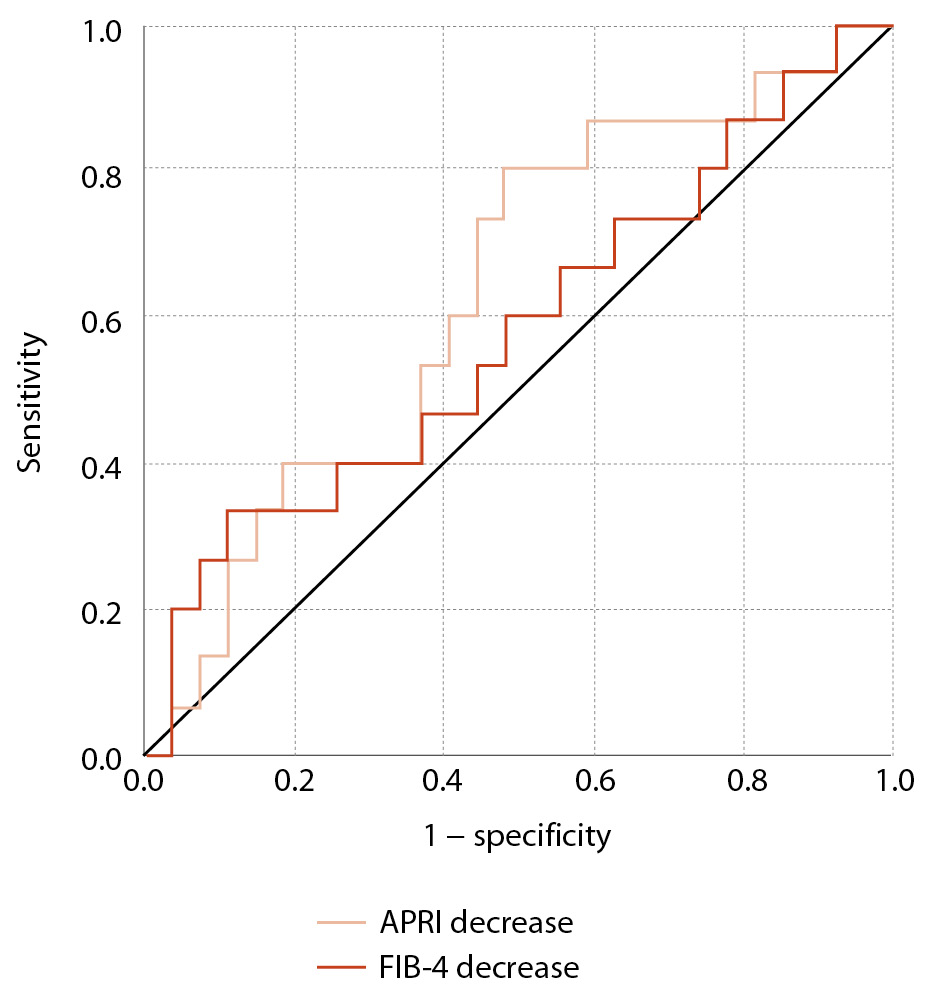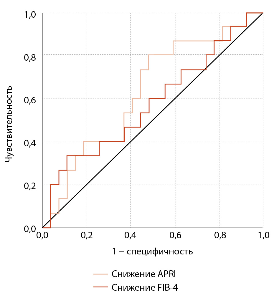 Значения AUROC по снижению APRI и FIB-4 для прогнозирования ВСПП составили 0,632 (95% ДИ 0,457–0,807; p = 0,160) и 0,578 (95% ДИ 0,391–0,764; p = 0,408) соответственно (рис. 2).