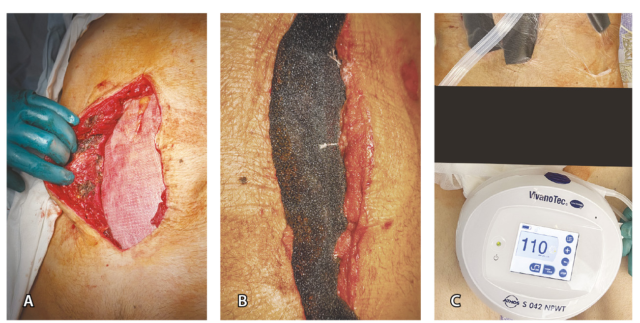 9. Fig. 4. Patient S., 70 years old, radical cystectomy with Bricker ileoconduit. At day 1 after the procedure, the postoperative course was complicated by perforation of the ileum and generalized serous to fibrinous peritonitis. A, a 3-stage laparostomy, muscle necrectomy from the medial laparotomy wound, change of the non-adhesive film covering the intestine loops; B, the aponeurosis edges are pushed together with aligning sutures, the wound bottom is filled with a polypropylene sponge; C, the external view of the wound; with attached device providing negative pressure (constant contour Р = 110 mmHg)