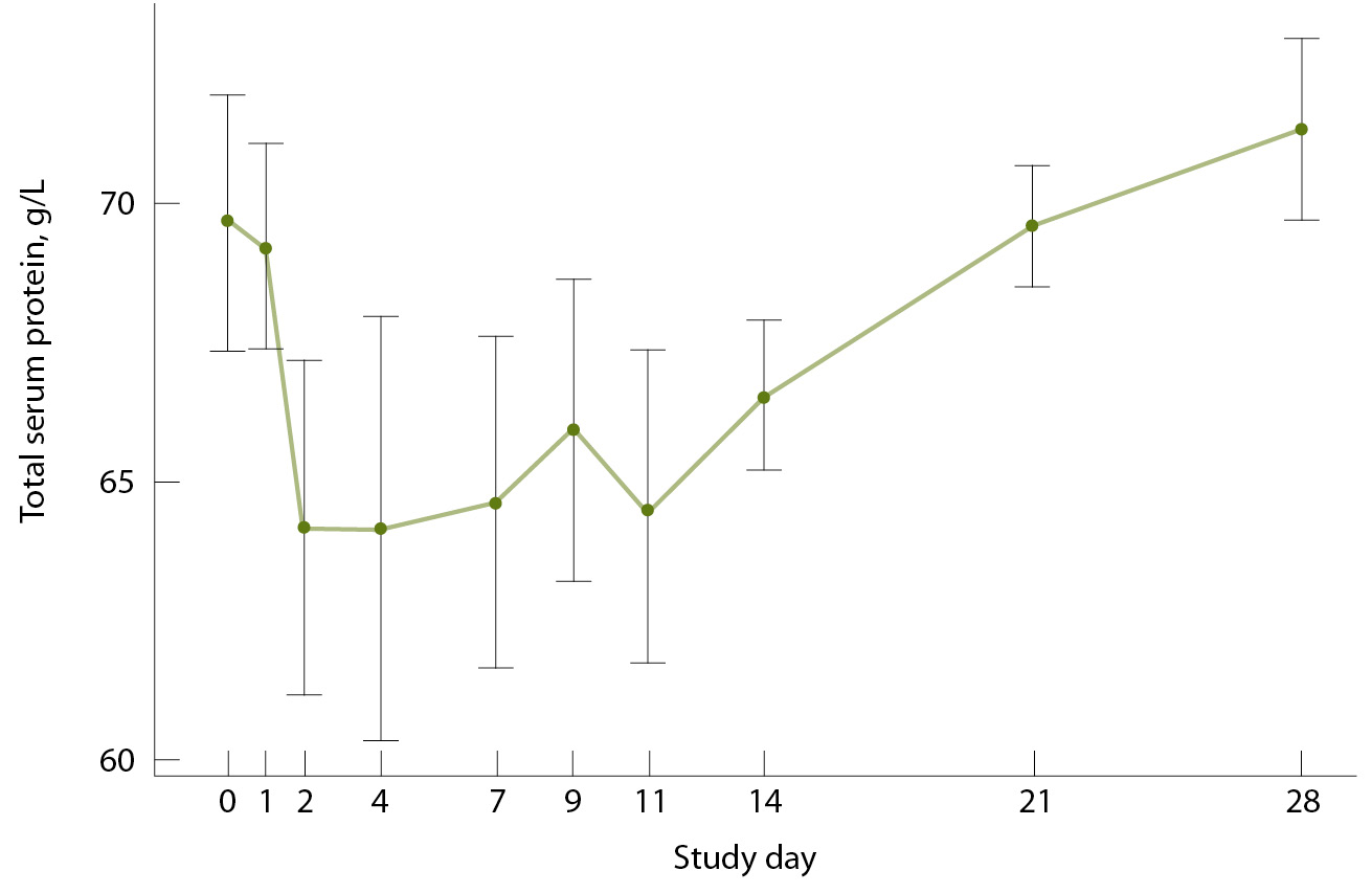 Фибриноген | 0,45 мг/кг | Скрининг | 3 | 3,10 | 3,75 | 0,09–7,41 | 1,47 | 2,72 | 5,44 | 2,91 | 4,27 | 1,36 | 1,000 |