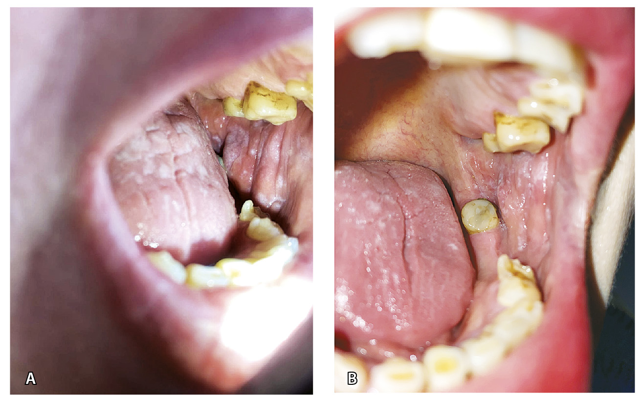 Рис. 5. Лихеноидные высыпания на слизистой оболочке полости рта и языка (правая щека): А – до лечения, Б – после лечения