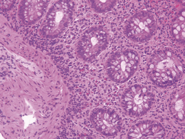 Рис. 9. Умеренная лимфоплазмоцитарная инфильтрация собственной пластинки слизистой оболочки толстой кишки, единичные нейтрофилы, структура крипт и бокаловидные клетки сохранены. Окраска гематоксилином и эозином; × 400
