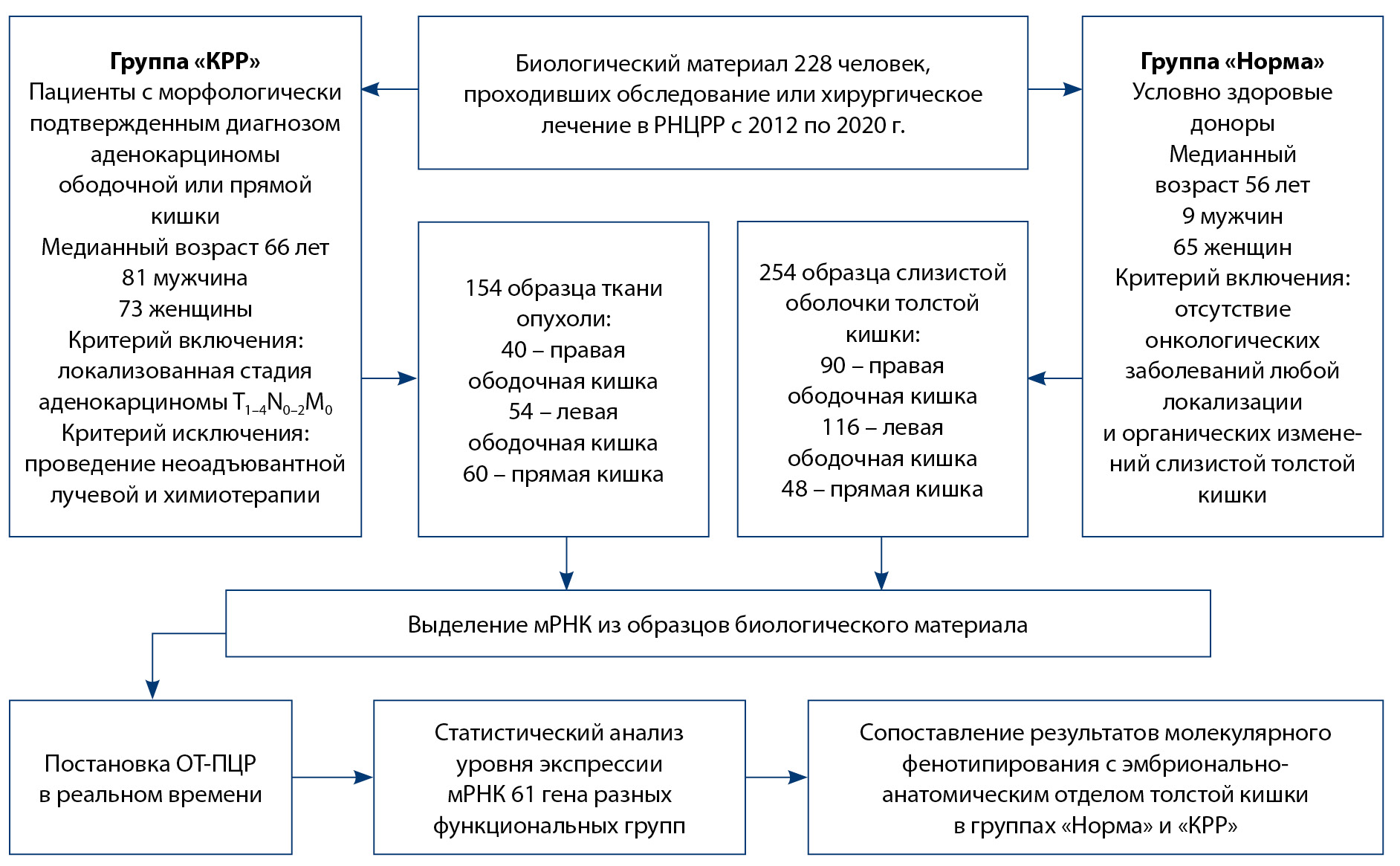 Проведено экспериментальное ретроспективное исследование молекулярных фенотипов (уровни экспрессии мРНК определенных генов) эмбрионально-анатомических отделов ТК в норме и при КРР (образцы нормальной слизистой оболочки ТК и аденокарциномы). Всего в исследовании использовано 408 образцов, полученных от 228 человек, которые проходили обследование или лечение в ФГБУ «Российский научный центр рентгенорадиологии» Минздрава России (РНЦРР) с 2012 по 2020 г. Информация для формирования базы медицинских данных участников исследования получена из информационной системы РНЦРР. Критерием включения образцов нормальной ткани в исследование было отсутствие онкологических заболеваний любой локализации и органических изменений слизистой ТК (условно здоровые доноры). Критерием включения образцов аденокарциномы было наличие локализованной стадии T1–4N0–2M0 аденокарциномы ободочной или прямой кишки в отсутствие неоадъювантной лучевой и химиотерапии (пациенты). Критерием невключения служили стадии TлюбаяNлюбаяM1 или T1–4N0–2M0 в случае получения неоадъювантной лучевой или химиотерапии.