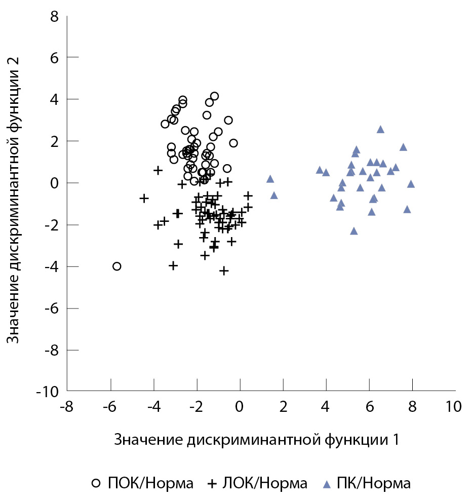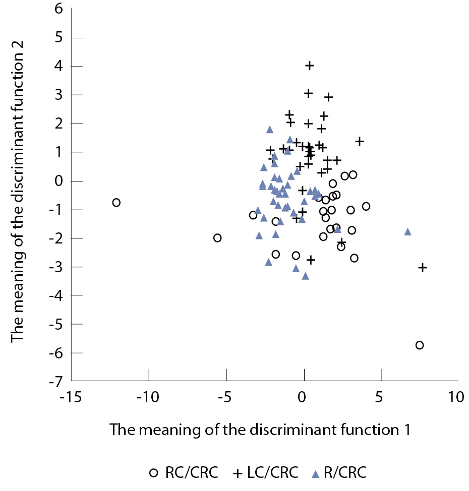 Сравнительный анализ категориальных значений по возрасту и полу между группами пациентов «Норма» и «КРР» для оценки сопоставимости групп показал, что они сопоставимы по возрасту. В группе «Норма» преобладали женщины. В этой группе статистически значимые различия в зависимости от пола получены только для маркера активности рецептора эстрогена ESR1 (р < 0,05) и маркера макрофагов CD68 (р < 0,05). Эти гены не были отобраны программой в дискриминантном анализе в качестве значимых при построении модели классификации для образцов тканей опухоли. Дискриминантный анализ данных выполняли с пошаговым включением переменных с использованием многомерного F-критерия Фишера (при уровне значимости p < 0,05). При проведении дискриминантного анализа с помощью программы Statistica v10 использовали опцию исключения «неполных образцов», то есть образцов, у которых отсутствуют данные одного или нескольких исследованных параметров. По этой причине общее количество образцов в приводимых таблицах может отличаться от суммарного количества исследованных.