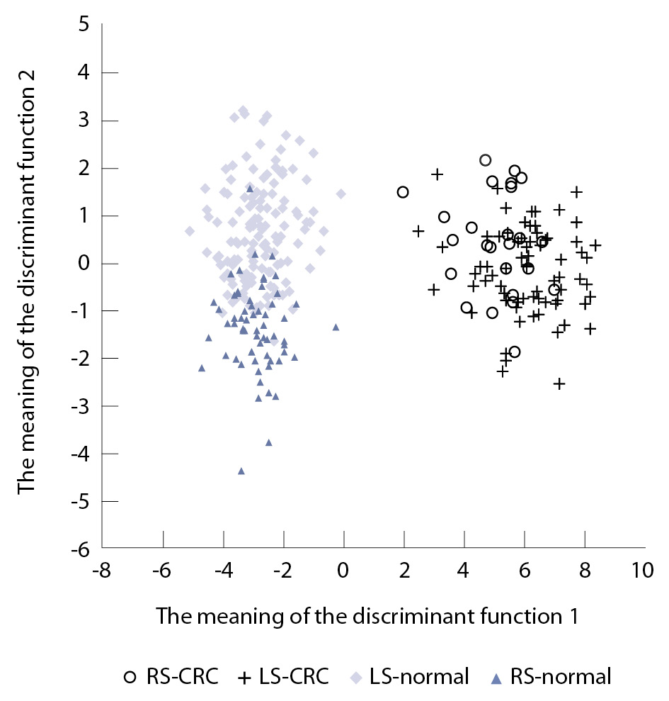 Materials and methods: We performed a retrospective study of molecular phenotypes (mRNA expression of 61 genes) from different embryonic-anatomical parts of healthy colon and CRC. The normal group included 254 samples of mucosa from three different parts of the colon from 74 healthy donors who had no cancer and no organic abnormalities of the colon, including 90 samples from the right colon, 116 from the left colon, and 48 from the rectum. The CRC group consisted of 154 samples of localized stage T1–4N0–2M0 adenocarcinoma from 154 patients who had not received neoadjuvant radio- and chemotherapy, including 40 samples from the right colon, 54 from the left colon, and 60 from the rectum. The relative mRNA abundance of 61 genes was assessed by reverse-transcriptase polymerase chain reaction. In both groups, the resulting expression phenotypes were compared between the anatomical parts of the colon. Statistical management of the data included the discriminant analysis with stepwise inclusion of variables.