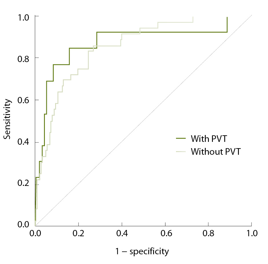 4. Fig. 2. ROC curves for the models for the outcome “platelet count ≥ 150 × 109/L” in the patients with liver cirrhosis with and without portal vein thrombosis (PVT)
