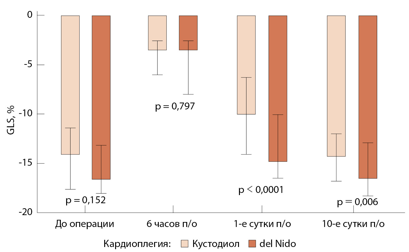 По величине показателя ФВ ЛЖ различий между группами выявлено не было ни через 6 часов после операции (р = 0,72), ни через сутки (р = 0,47), ни через 10 дней (р = 0,43). Однако послеоперационная динамика продольной деформации ЛЖ продемонстрировала статистически значимую межгрупповую разницу через сутки после операции (сумма квадратов 364,028, DF = 1, средний квадрат 364,028, F = 10,43; p < 0,001). К концу первых послеоперационных суток показатель GLS имел более негативную динамику в группе «Кустодиол» по сравнению с таковой в группе “del Nido” (-10 [-14,1; -6,27] против -14,8 [-16,5; -10]%; р < 0,0001). К 10-м послеоперационным суткам имелась тенденция улучшения GLS в обеих группах наблюдения, но в группе “del Nido” его значения были статистически значимо выше (р = 0,006) (рис. 2). Показатель GSR в дисперсионном анализе не различался между группами сравнения (сумма квадратов 0,0982, DF = 1, средний квадрат 0,0982, F-критерий 0,51; р = 0,47), но при этом межгрупповые различия по данному показателю к концу первых послеоперационных суток оказались статистически значимыми (-0,71 [-0,9; -0,52] с-1 в группе “del Nido” и -0,57 [-0,760; - 0,44] с-1 в группе «Кустодиол»; р = 0,0049) (см. табл. 1).