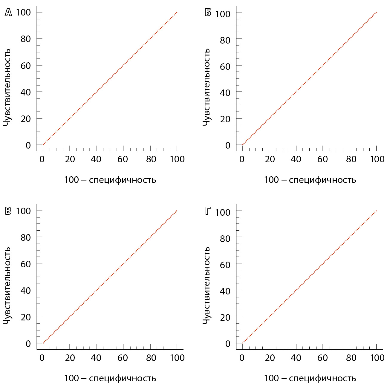 Чувствительность и специфичность пороговых значений экскреции с мочой дегидроэпиандростерона (А; чувствительность 100%, специфичность 100%, критерий ≤ 469), тетрагидро-11-дезоксикортизола (Б; чувствительность 100%, специфичность 100%, критерий ≤ 223), 3β,16,20-прегнентриола (В; чувствительность 100%, специфичность 100%, критерий ≤ 130) и соотношения 3α,16,20-dР3/3β,16,20-dР3 (Г; чувствительность 100%, специфичность 100%, критерий > 2,13) для оценки результатов ответа на полихимиотерапию у больных адренокортикальным раком после хирургического лечения