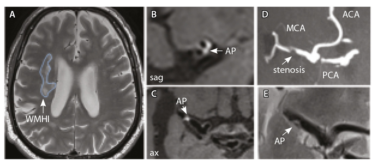 Всем пациентам проводили исследование на МР-томографе с величиной индукции магнитного поля 3 Тесла MAGNETOM Prisma (Siemens, Германия). Протокол исследования включал в себя последовательности Т2-FLAIR (англ. Fluid Attenuated Inversion-Recovery – последовательность «инверсия – восстановление» с ослабленным сигналом от жидкости) и Т2-ВИ головного мозга для оценки очаговых изменений в веществе мозга. Для выявления стенозирующего процесса и локализации АСБ выполняли следующие исследования: