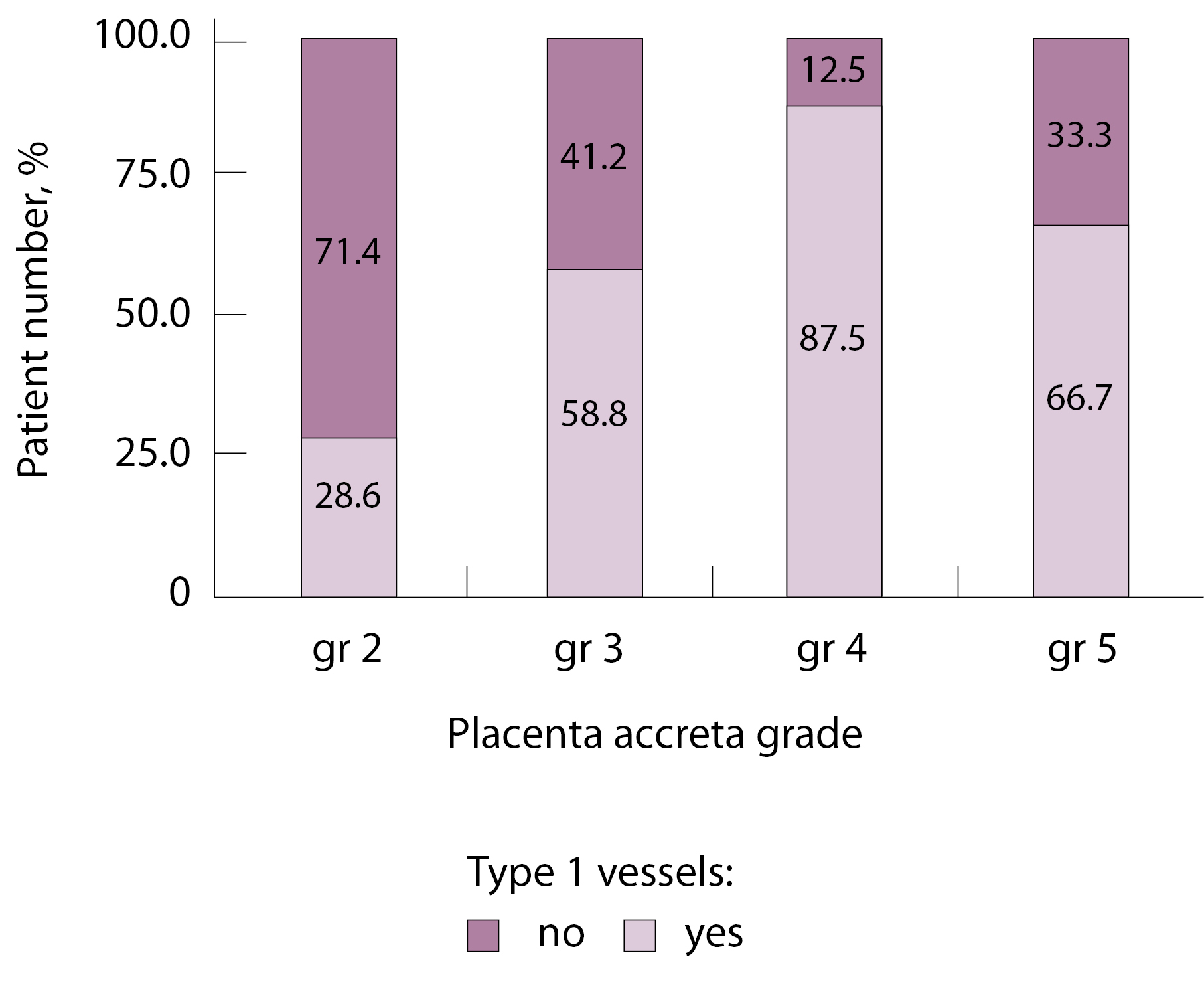 Как видно на рис. 6, сосуды 2-го типа не встречались в норме и при плотном прикреплении плаценты (gr 2), с одинаковой частотой наблюдались при pl. accreta (gr 3) и pl. increta (gr 4) и были обнаружены у 94,4% пациенток с pl. percreta (gr 5) (р < 0,001, хи-квадрат Пирсона).