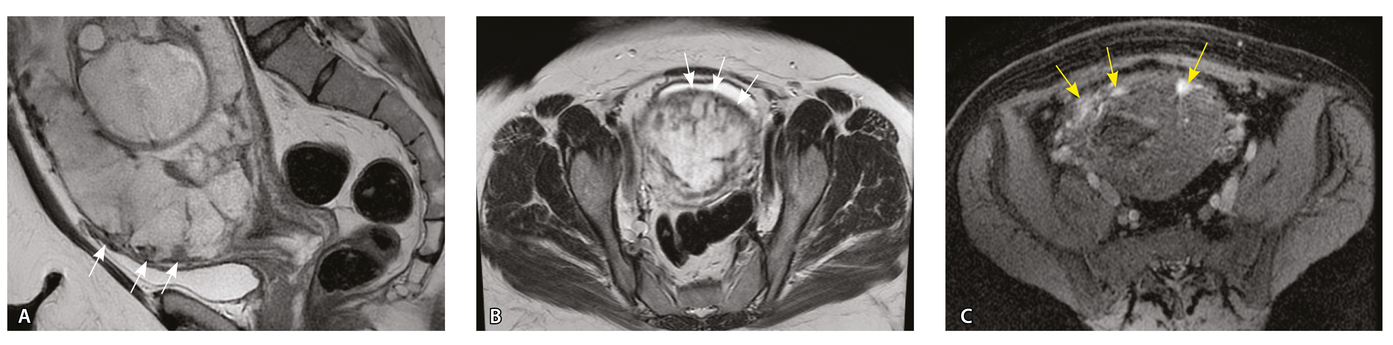 Рис. 4. Беременность 32 недели, pl. accreta, PAS 1 по FIGO. На магнитно-резонансных томограммах в режиме Т2-взвешенного изображения в сагиттальной (А) и аксиальной (Б) плоскостях видны сосуды на границе маточно-плацентарной области, сливающиеся между собой (белые стрелки), без выраженного дефицита толщины миометрия и рубца от кесарева сечения, без признаков выбухания стенки матки. На Т1-взвешенном изображении в режиме подавления сигнала от жировой ткани в аксиальной плоскости (В) выявляется наличие участков повышенного сигнала (желтые стрелки) на границе маточно-плацентарной области, что соответствует геморрагическому компоненту в подострой/хронической стадии (ретроплацентарные гематомы) либо белковому содержимому (фибриноид)