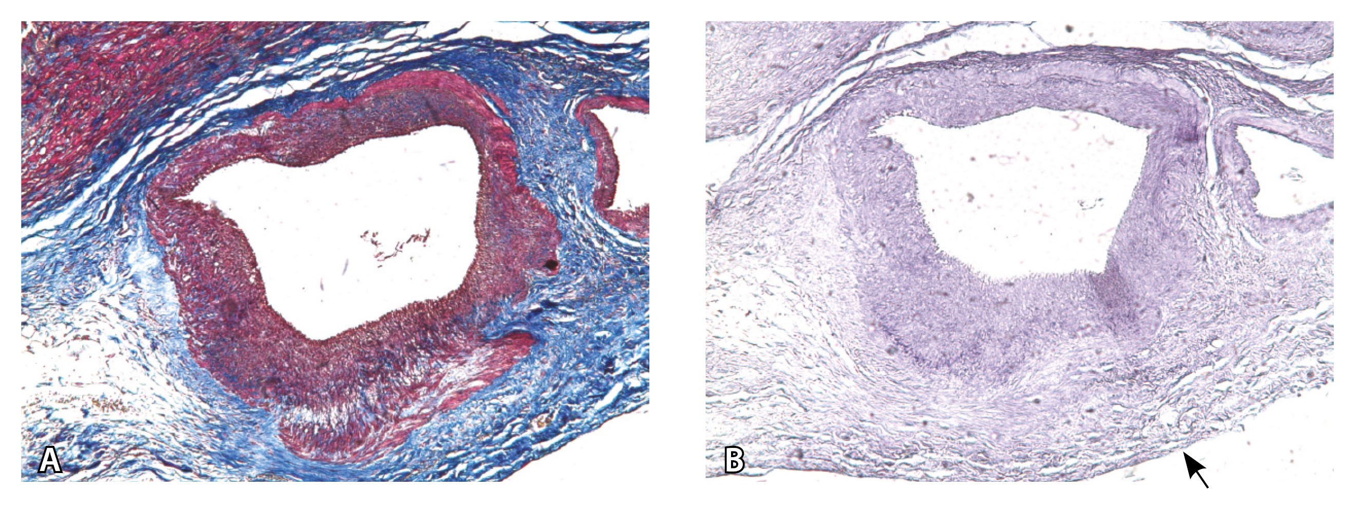 Рис. 8. Сосуды 3-го типа при гиперваскуляризации стенки матки при патологической инвазии. Внутриматочная гиперваскуляризация с дефицитом толщины миометрия, наличием рубцовой ткани, недостаточная гестационная перестройка радиальных артерий (аналог pl. increta, PAS 2 по FIGO). А – неполная гестационная перестройка радиальной артерии в составе миометрия (окраска по Маллори; × 50); в верхней части просвета артерии виден слой фибриноида, замещающего эндотелий, такой же фрагмент – в нижней части артерии (стрелка); Б – серийный срез той же радиальной артерии с визуализацией инвазирующего цитотрофобласта (маркер цитокератин 8; × 50); В – серийный срез той же радиальной артерии, при окраске на выявление эластических волокон видна полная дезорганизация эластического каркаса вместо нормальных внутренней и внешней эластических мембран, результат действия инвазирующего цитотрофобласта (окраска по Вейгерту; × 50)