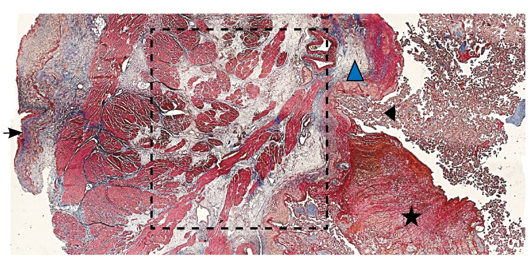 Рис. 16. Гистологическое исследование маточно-плацентарного сегмента при pl. percreta, определенной по данным магнитно-резонансной томографии. Окраска пикрофуксином по Маллори (красный цвет – мышечные волокна, голубой – соединительная ткань). Стенка мочевого пузыря плотно сращена с истонченным маточным сегментом, характеризуется наличием кровеносных сосудов (синяя стрелка). Фиброз задней стенки мочевого пузыря, разобщенные мышечные пучки, замурованные в соединительную ткань (поле отмечено пунктиром). Инвазия ворсин плаценты в бухты миометрия (помечена черным треугольником). Слизистая мочевого пузыря показана стрелкой. Ретроплацентарная гематома помечена звездочкой. Коллаж из 12 фото при увеличении × 100