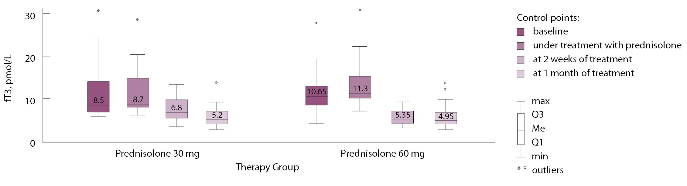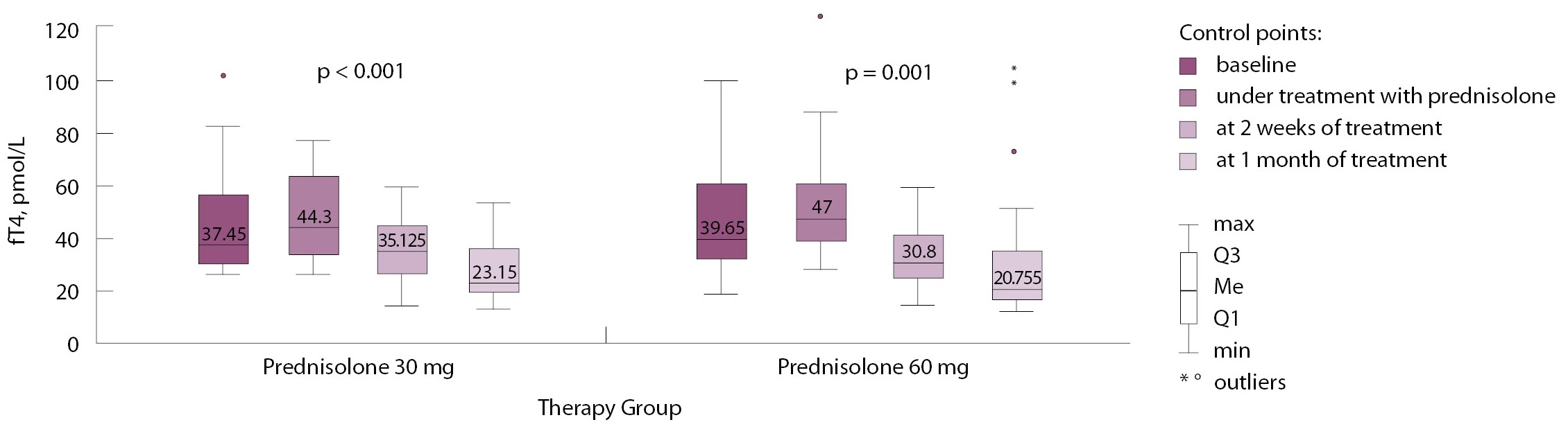 В проспективное интервенционное рандомизированное открытое контролируемое исследование включено 44 пациента с АмИТ2. С помощью открытой блоковой рандомизации с использованием таблицы случайных чисел сформированы 2 группы по 22 человека, получивших лечение преднизолоном в разных стартовых дозах: 30 мг/сут (активный контроль) и 60 мг/сут (основная группа). После достижения эутиреоза оценку функционального состояния щитовидной железы (определение уровней тиреотропного гормона (ТТГ), свТ4 и свободного трийодтиронина (свТ3)) осуществляли: при снижении дозы преднизолона дважды (через 1 и 2 месяца), после отмены преднизолона – через 1, 3, 6, 9 и 12 месяцев.