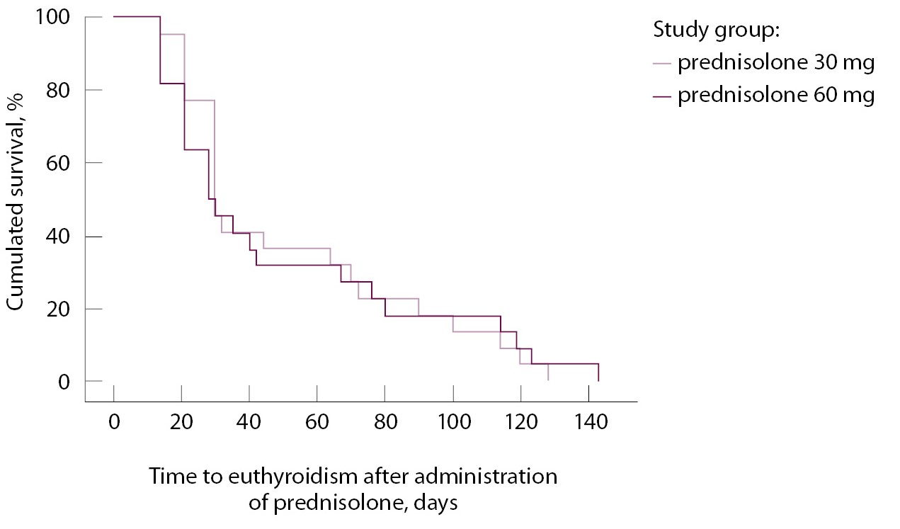 Время достижения эутиреоза в группах было сопоставлено с помощью кривых Каплана – Мейера (логранговый критерий Мантела – Кокса 0,859). Медиана срока достижения эутиреоза у пациентов, получавших 30 мг преднизолона, составила 30,0 ± 3,2 (95% доверительный интервал (ДИ) 23,7–36,3) дня, средний срок – 51,9 ± 7,8 (95% ДИ 36,7–67,2) дня; в группе 60 мг преднизолона – 28,0 ± 6,6 (95% ДИ 15,1–40,9) дня, средний срок – 49,7 ± 8,8 (95% ДИ 39,4–62,2) дня. Медиана срока в общей когорте составила 30,0 ± 1,5 (95% ДИ 27,1–32,9) дня, среднее время – 50,8 ± 5,8 (95% ДИ 39,4–62,2) дня (рис. 3). Отсроченное достижение эутиреоза (> 30 дней приема ГК) отмечалось в обеих группах в 50% случаев: в группе 30 мг преднизолона – у 3 (13,6%) пациентов в течение 60 дней терапии, у 3 (13,6%) – 90 дней и у 5 (22,7%) – более 90 дней, в группе 60 мг преднизолона – у 3 (13,6%) пациентов в течение 60 дней терапии, у 3 (13,6%) – 90 дней и у 4 (18,2%) – более 90 дней. Отсутствие смешанной формы АмИТ у пациентов с длительным достижением ремиссии (более 90 дней) подтверждалось результатами повторной сцинтиграфии с 99mTcO4 и оценкой уровня АТ-рТТГ в динамике.