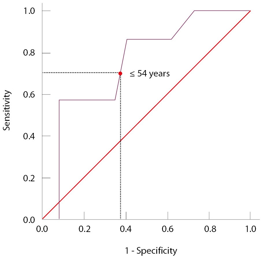 Тяжесть тиреотоксикоза условно оценивалась по максимальным значениям свободных фракций тиреоидных гормонов. У 6 (13,6%) пациентов наблюдалось легкое течение АмИТ2 (свТ4 < 40 пмоль/л, свТ3 < 10 пмоль/л), у 31 (70,5%) – средней тяжести (свТ4 40–80 пмоль/л, свТ3 10–20 пмоль/л), у 7/44 (15,9%) – тяжелое (свТ4 > 80 пмоль/л, свТ3 > 20 пмоль/л). Подгруппы тяжелого и нетяжелого течения различались по возрасту (р = 0,038) и объему щитовидной железы (р = 0,020). При оценке предикторов статистически значимым был только возраст (ОШ 0,912, 95% ДИ 0,831–1,000, р = 0,049). Пороговое значение определено с помощью метода ROC-кривых: у пациентов в возрасте ≤ 54 лет прогнозировался высокий риск тяжелого течения АмИТ2 (AUC (англ. area under curve, площадь под кривой) 0,749 ± 0,095 (95% ДИ 0,562–0,936); р = 0,038; чувствительность 71,4%, специфичность 62,2%) (рис. 5).