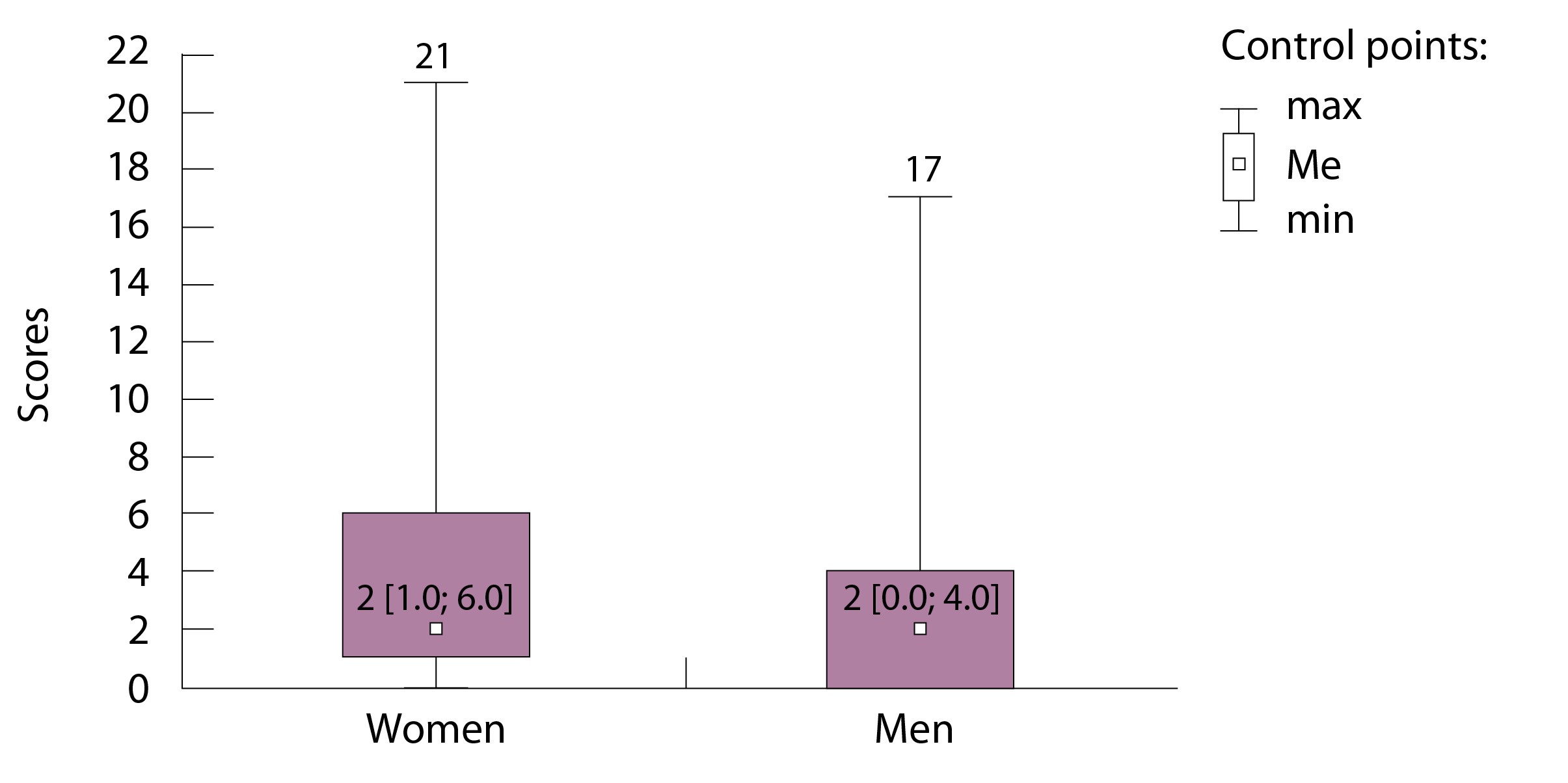 Выбраны 2 показателя – пол и уровень образования, при оценке которых мы предполагали установить отсутствие связи между баллом за опросник и ответом на соответствующий вопрос анкеты. Для оценки дискриминативной валидности пациенты были разделены на 2 группы: мужчины (n = 419) и женщины (n = 408). Получено ненормальное распределение балла за тест (p < 0,05, критерий Шапиро – Уилка). Для оценки этого типа валидности использовали сумму баллов без учета дополнительного вопроса для женщин. Как видно на рис. 1, в выборках мужчин и женщин была одинаковая медиана балла, однако генеральные совокупности отличались (р = 0,000083, критерий Манна – Уитни).