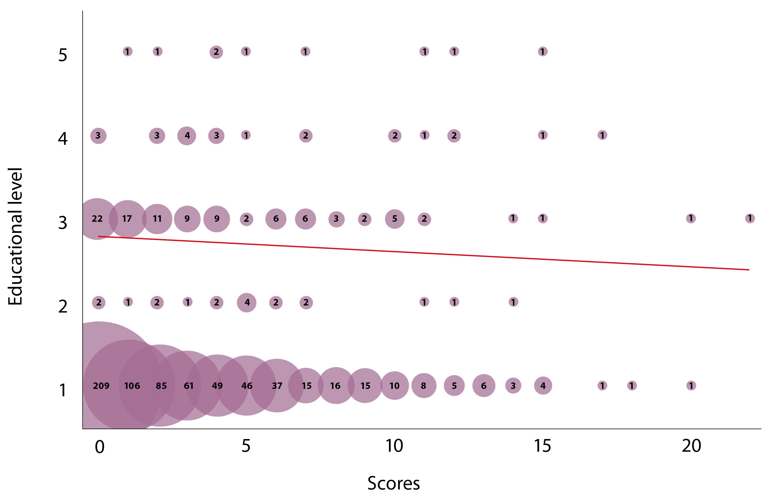 Для оценки связи между уровнем образования и баллом выбран ранговый коэффициент корреляции Спирмена, при этом уровню образования присвоены следующие ранги: 1 – среднее образование, 2 – среднее специальное, 3 – высшее, 4 – имеется степень кандидата наук, 5 – имеется степень доктора наук. Количество исследуемых пар – 827 (1 анкета была исключена из анализа в связи с пропуском данных при заполнении графы «Образование»). В результате анализа (рис. 2) установлена слабая связь между исследуемыми признаками (r = 0,157203, р < 0,05).