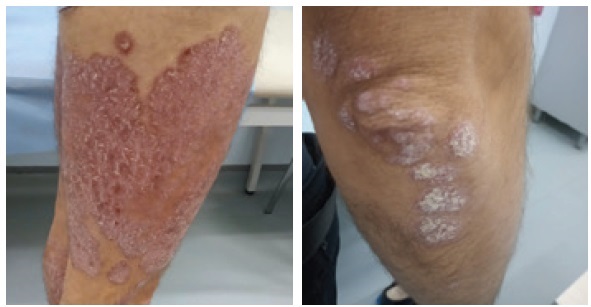 Плоские бляшки розового-красного цвета, склонные к слиянию, или бляшки с серебристо-белыми чешуйками на теле Нет Да | |