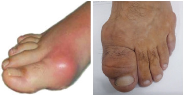 Припухлость, боль и изменение температуры кожи над областью суставов первого пальца стопы Нет Да |
