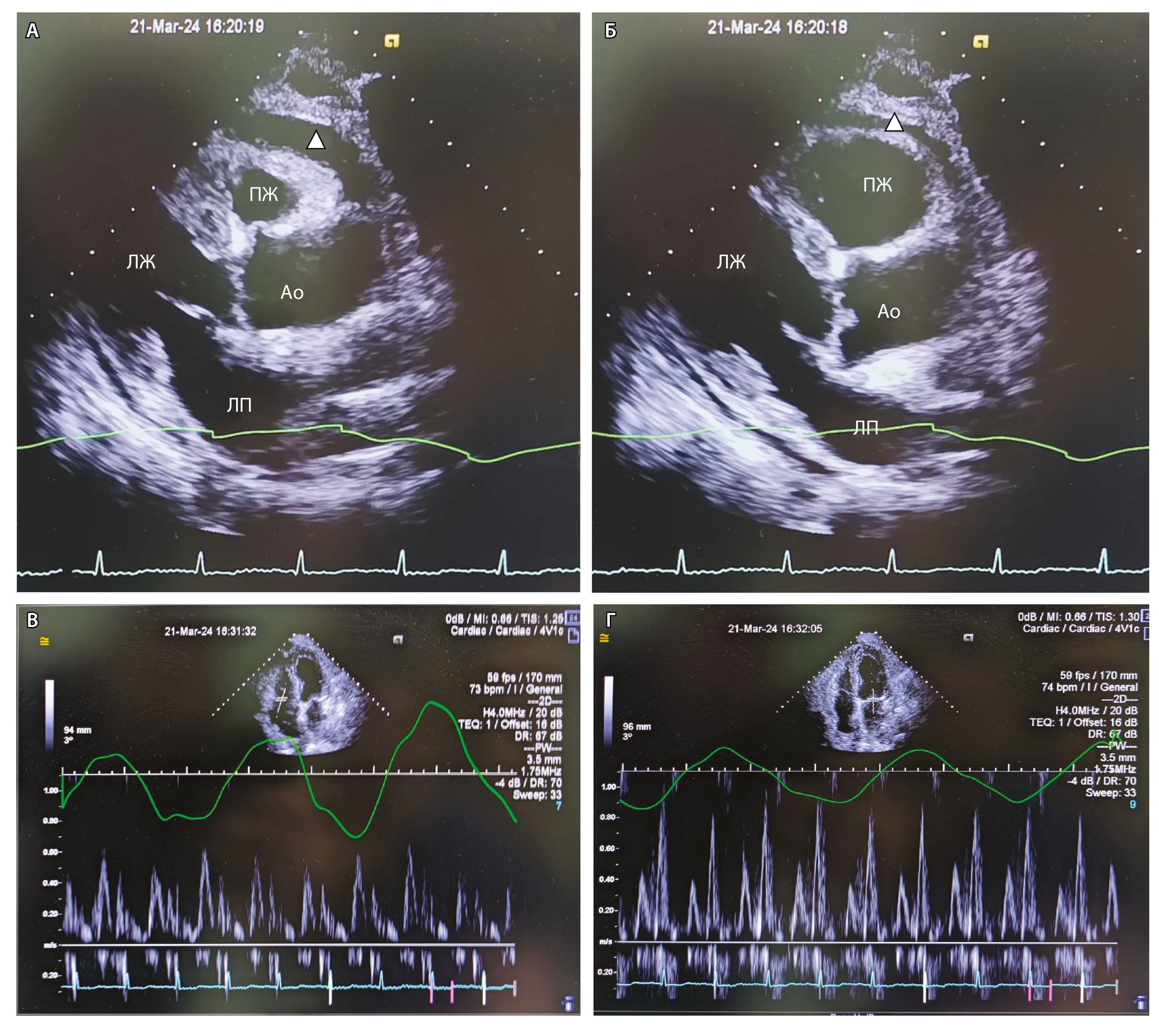 Рис. 3. Эхокардиограмма пациента: А – парастернальная позиция, длинная ось ЛЖ, систола; Б – парастернальная позиция, длинная ось ЛЖ, диастола; В – доплеровское исследование транстрикуспидального кровотока; Г – доплеровское исследование трансмитрального кровотока. Ао – аорта, ЛЖ – левый желудочек, ЛП – левое предсердие, ПЖ – правый желудочек. Белый треугольник указывает прослойку жидкости в перикарде