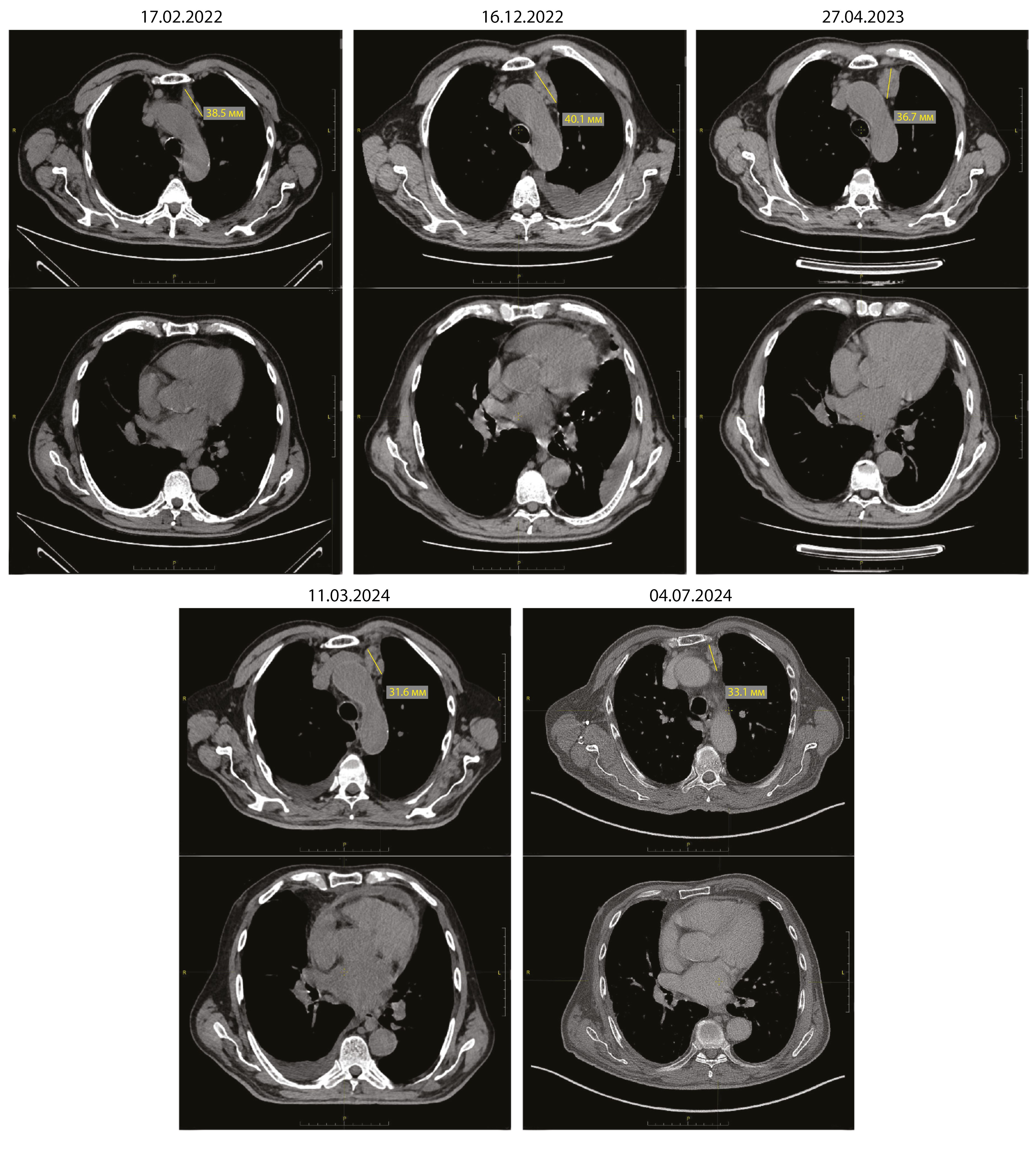 В начале декабря 2022 г. – повышение температуры тела до 38,5 °C, получал антибактериальную терапию в связи с пневмонией. ПЦР на РНК SARS-CoV-2 (14.12.2022) – отрицательно, при КТ ОГК (16.12.2022) признаки двусторонней пневмонии, возможно вирусной этиологии (КТ-1), левосторонний гидроторакс с признаками осумкования. Медиастинальная лимфаденопатия (внутригрудные лимфатические узлы размером до 11 мм, парааортальные – до 18 мм), интерпретирована как последствия перенесенной коронавирусной инфекции. Сохранялась лихорадка, нарастала слабость, масса тела снизилась на 5 кг, периодически беспокоила неангинозная боль в левой половине грудной клетки.