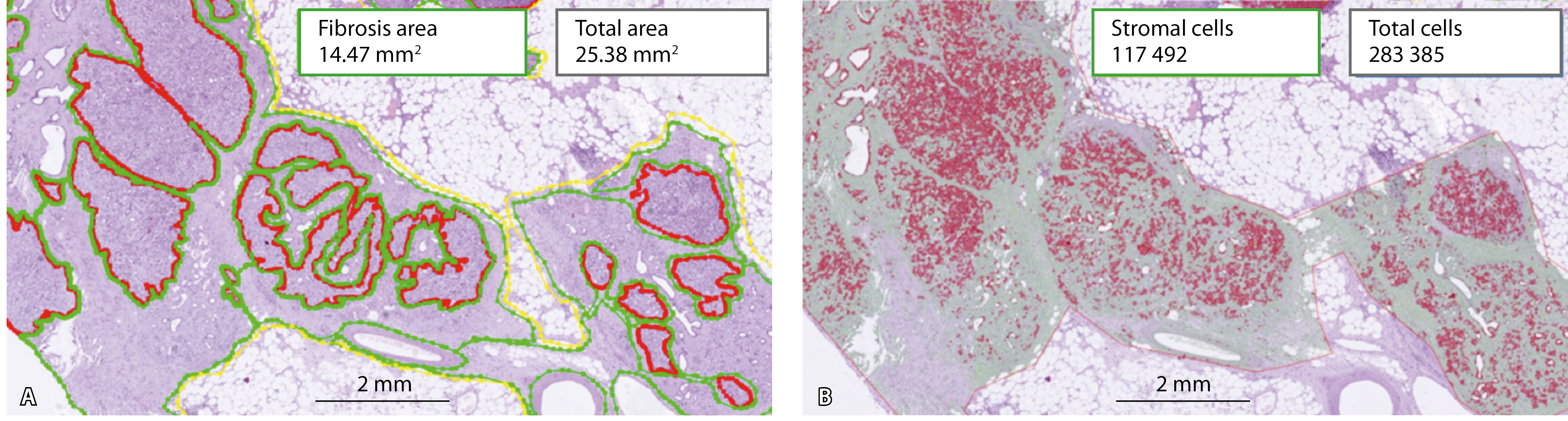 Для валидации методов оценки фиброза с применением цифровых инструментов использовали программное обеспечение с открытым исходным кодом – Automated Slide Analysis Platform (ASAP, версия 2.2.0, https://computationalpathologygroup.github.io/ASAP). С помощью специальных инструментов разметки были выделены и аннотированы вручную следующие области фрагмента ткани поджелудочной железы: паренхиматозные дольки поджелудочной железы (P), фиброзная ткань (F), жировая ткань (L). Произведен расчет суммарной площади каждого из классов с дальнейшим вычислением процента фиброза (F%) по формуле: