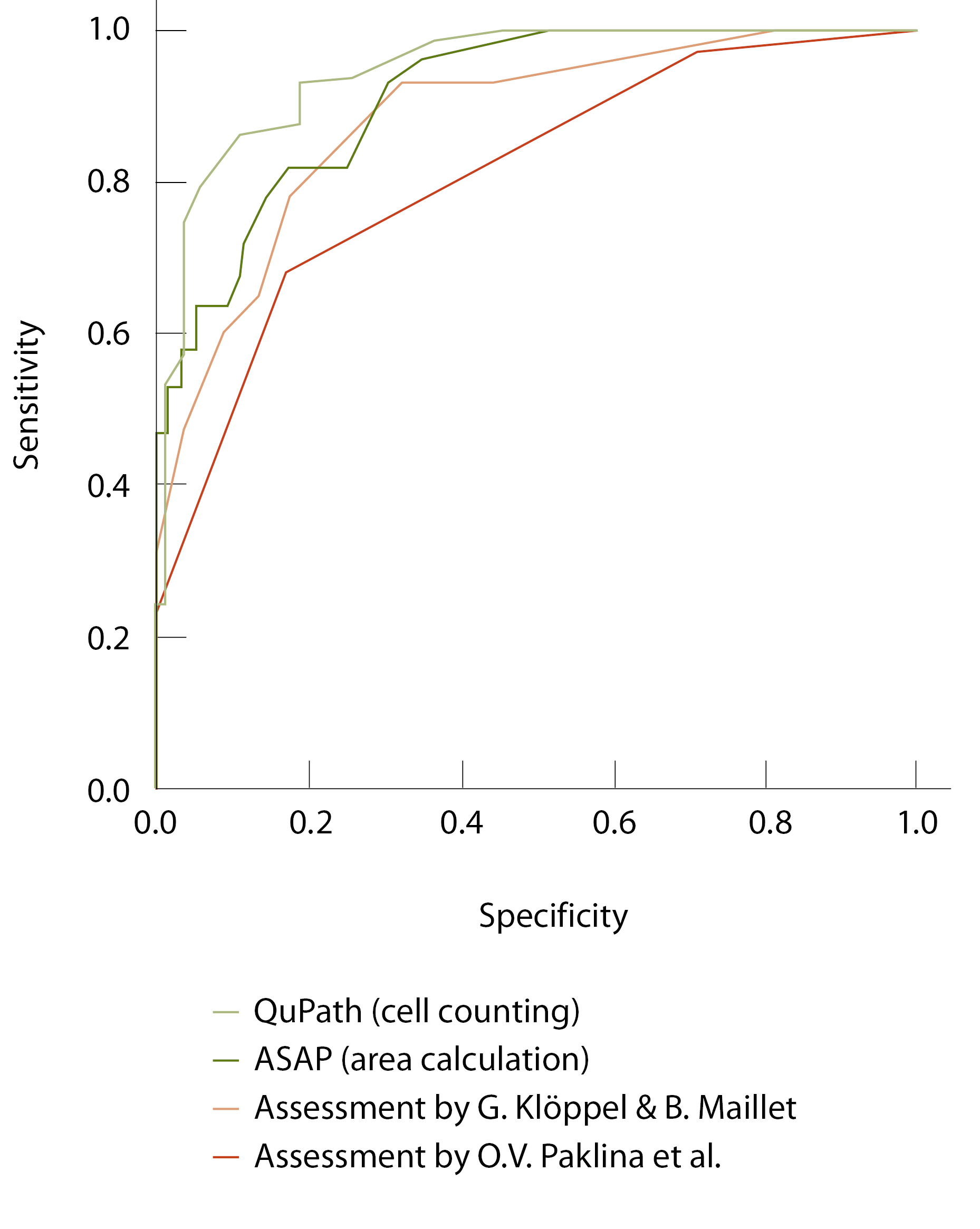 Для сравнения четырех методов оценки степени фиброза поджелудочной железы относительно точности диагностики ХП был проведен ROC-анализ (рис. 3, табл. 4) с определением чувствительности, специфичности и суммарной меры точности – площади под кривой (AUC). Оценка фиброза с помощью QuPath показала лучший результат (чувствительность – 89,4%, специфичность – 86,1%, AUC = 0,943). Оценка с помощью метода площадей на платформе ASAP также характеризовалась более высокими показателями (чувствительность – 78,2%, специфичность – 85,9%, AUC = 0,910) в сравнении с классическим методом оценки фиброза по шкале G. Klöppel, B. Maillet (чувствительность – 74,1%, специфичность – 85,0%, AUC = 0,879). Оценка фиброза по О.В. Паклиной и соавт. продемонстрировала в данном исследовании точность диагностики ХП на уровне AUC = 0,808 c чувствительностью 67,2% и специфичностью 83,6%, которые все еще считаются хорошими показателями.