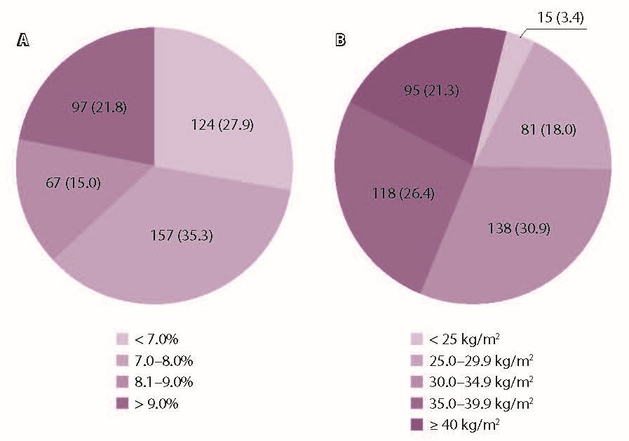 Рис. 1. Распределение пациентов в зависимости от уровня гликированного гемоглобина (А) и индекса массы тела (Б) до назначения препарата иГларЛикси. Данные представлены как абсолютное число пациентов и их доля (%) в группе