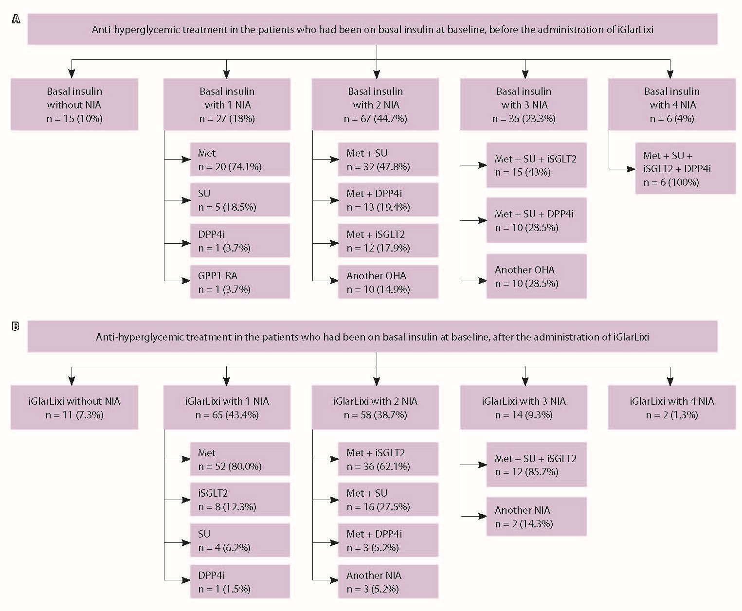 Рис. 3. Структура сахароснижающей терапии в группе больных, получавших ПНИР без инсулина, до (А) и после (Б) назначения иГларЛикси. иГларЛикси – фиксированная комбинация инсулина гларгин 100 Ед/мл и ликсисенатида, иДПП-4 – ингибиторы дипептидилпептидазы 4-го типа, иНГЛТ-2 – ингибиторы натрий-глюкозного котранспортера 2-го типа, Мет – метформин, ПНИР – препараты неинсулинового ряда, ПСМ – препараты сульфонилмочевины. Данные представлены как абсолютное число пациентов и их доля (%) в группе. По горизонтали за 100% принято общее число пациентов, исходно получавших ПНИР. По вертикали за 100% принято общее число пациентов, получавших определенное количество ПНИР до назначения препарата иГларЛикси (А) и после назначения иГларЛикси (Б)