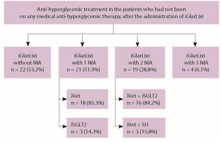 В группе больных, которые исходно не получали медикаментозную ССТ, иГларЛикси был назначен не только в качестве монотерапии, но и в комбинации с ПНИР. В 6,1% случаев (n = 4) к препарату иГларЛикси была добавлена тройная комбинация ПНИР (рис. 4).