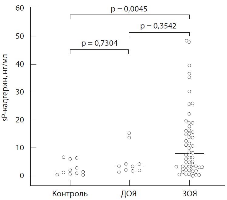 Концентрацию растворимой формы Р-кадгерина определяли в сыворотке крови, полученной по стандартной методике до начала лечения, с помощью набора реактивов для иммуноферментного анализа Human P-Cadherin ELISA Kit (RayBiotech, США) в соответствии с инструкциями производителя. Измерения проводили на автоматическом иммуноферментном анализаторе BEP 2000 Advance (Siemens Healthcare Diagnostics, Германия). Содержание маркера выражали в нанограммах (нг) на 1 мл сыворотки крови.