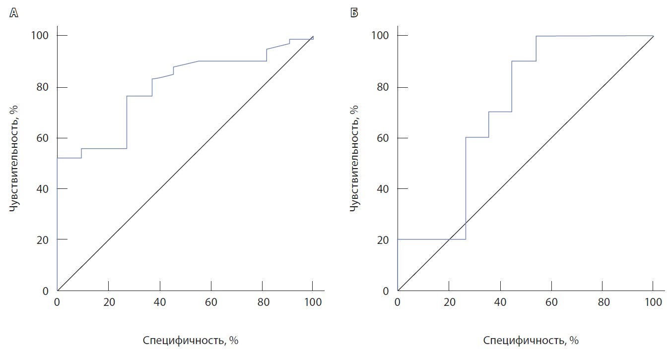 Полученные данные обрабатывали с помощью программы GraphPad Prizm 10.0. При сравнении показателей и анализе их взаимосвязей использовали непараметрические критерии Манна – Уитни, Краскела – Уоллиса, коэффициент ранговой корреляции Спирмена. Анализ информативности диагностического метода с помощью оценки его чувствительности и специфичности проводили с помощью построения ROC-кривых и вычисления площади под ними (англ. area under the curve, AUC). Различия и корреляции считали статистически значимыми при p < 0,05.