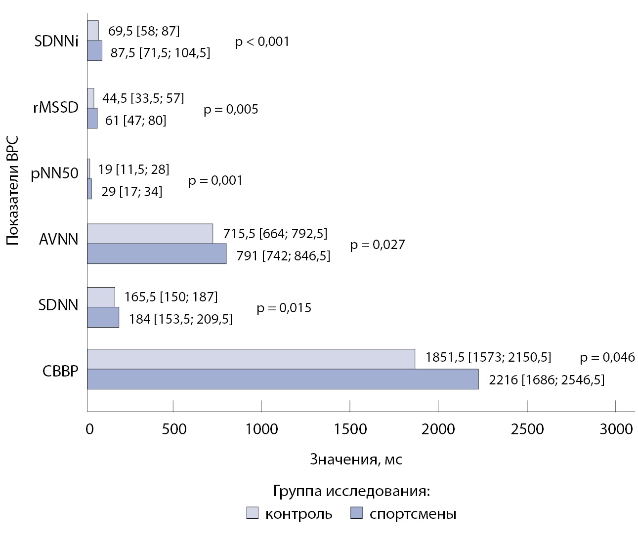 Параметр, Me [Q1; Q3], уд/мин | Группа спортсменов (n = 86) | Контрольная группа (n = 74) | Значение р |