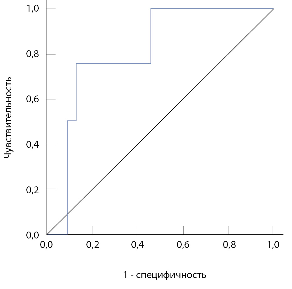 Для описания данных, не соответствующих нормальному распределению, использовали медиану и квартили (первый и третий) в формате Me [Q1; Q3]. Статистическую значимость различий между анализируемыми показателями оценивали с помощью непараметрического U-теста Манна – Уитни. Для выявления взаимосвязей между переменными применяли ранговую корреляцию, используя коэффициент Спирмена. Для оценки диагностической значимости отдельных параметров проведен ROC-анализ с определением точек отсечения. Расчет и оценку отношения шансов и его 95% доверительного интервала (ДИ) выполняли с помощью однофакторной логистической регрессии. Критическим уровнем значимости (р) считали 0,05. Математическая обработка материала проведена с использованием статистического пакета Statistica 12, IBM SPSS Statistics 26.