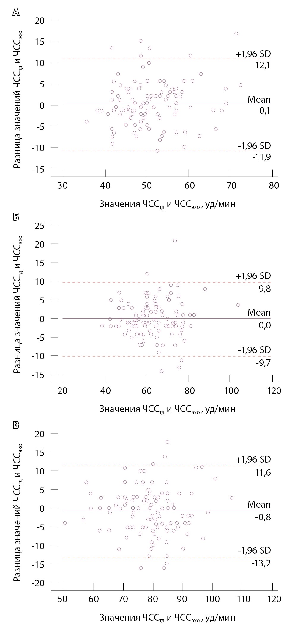 Рис. 3. Диаграммы Бланда – Альтмана для различий в показателях частоты сердечных сокращений, фиксированных при проведении термодилюции (ЧССтд) и при эхокардиографии (ЧССэхо) на этапах начала операции (А), в конце операции (Б) и в конце первых послеоперационных суток (В). Mean – среднее арифметическое значение, SD – стандартное отклонение