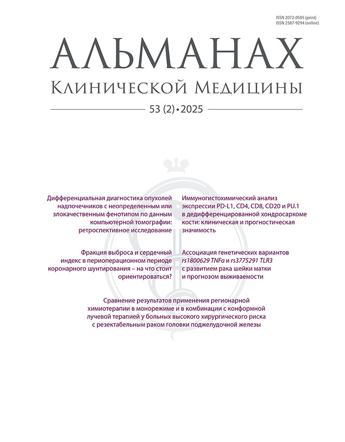 R. Iseulys и соавт. выдвинули гипотезу о возможной роли экспрессии PD-L1 в стромальных клетках дедифференцированной хондросаркомы как потенциального благоприятного прогностического маркера. Авторы выявили 3 образца, в которых отмечалась экспрессия PD-L1 в лимфоцитах стромы. Все пациенты с такими опухолевыми характеристиками оставались живы на момент проведения исследования. Однако, учитывая малое число наблюдений, данное предположение должно быть проверено на более объемной выборке [10]. В целом опубликованы единичные исследования, посвященные клинической значимости иммунных клеток в развитии дедифференцированной хондросаркомы [15]. Мы подтвердили данные литературы, согласно которым доминирующая популяция иммунных клеток опухолевой стромы – макрофаги [10]. Наибольшее число макрофагов в дедифференцированном компоненте опухоли выявлено в том случае, когда дедифференцированный компонент представлен недифференцированной саркомой. Отметим также, что высокая макрофагальная инфильтрация дедифференцированной хондросаркомы имела тенденцию к неблагоприятному течению заболевания, что характерно для большинства солидных опухолей [16]. В нашем исследовании содержание макрофагов в строме опухоли прямо положительно коррелировало с экспрессией PD-L1 как в хондроидном, так и в дедифференцированном компонентах опухоли, а также с содержанием Т-клеток, что может указывать на иммуногенность данных опухолей и их потенциальную чувствительность к ингибиторам контрольных точек.