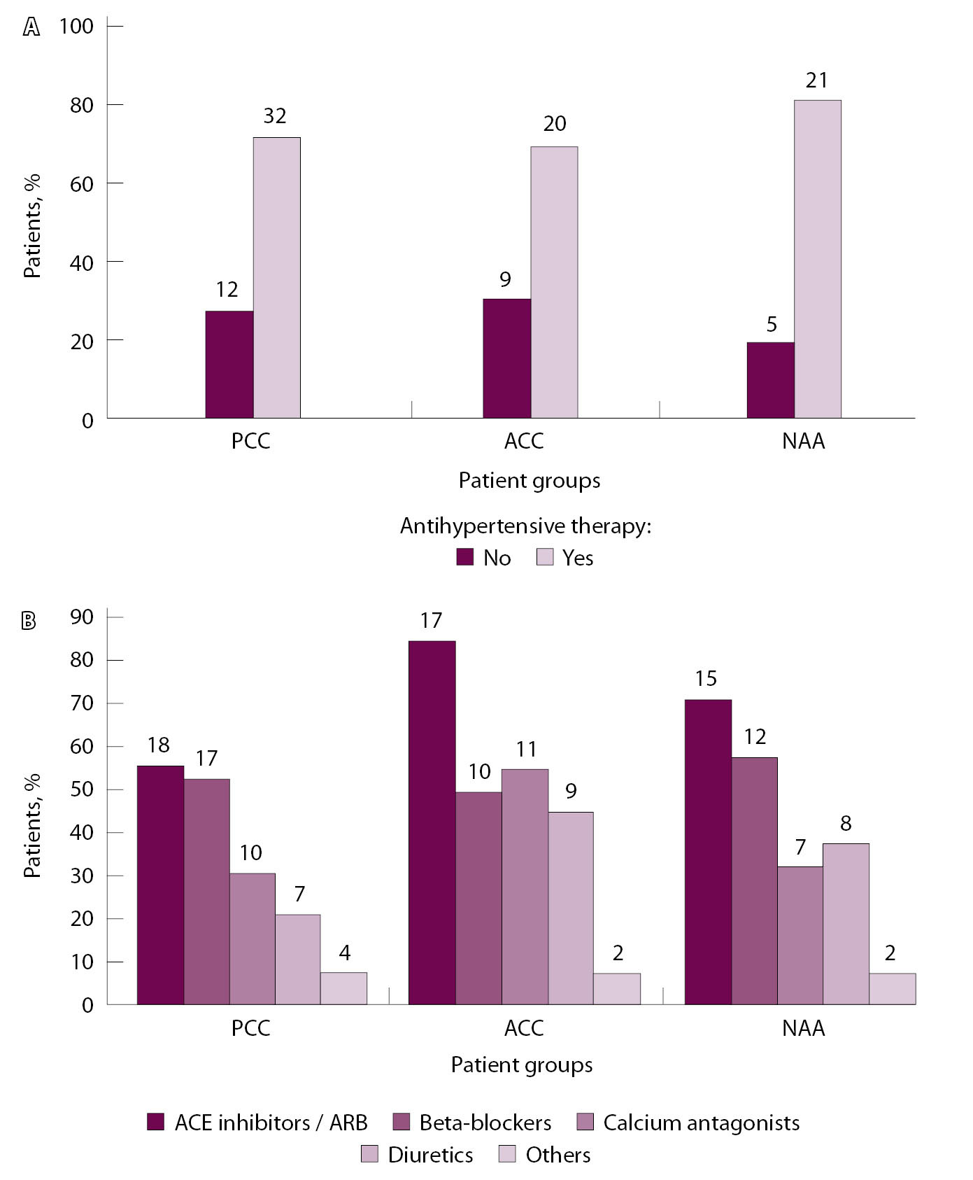 Рис. 1. Сведения об антигипертензивной терапии на момент оценки артериального давления у обследованных пациентов в зависимости от вида опухоли надпочечника: доля пациентов, получавших лечение (А), и частота применения различных видов антигипертензивной терапии в качестве монотерапии или в комбинации (Б). Над столбцами указано абсолютное количество пациентов. АКР – адренокортикальный рак, АПФ – ангиотензинпревращающий фермент, БРА – блокаторы рецепторов ангиотензина, ГНОН – гормонально-неактивные опухоли надпочечников, ФХЦ – феохромоцитома