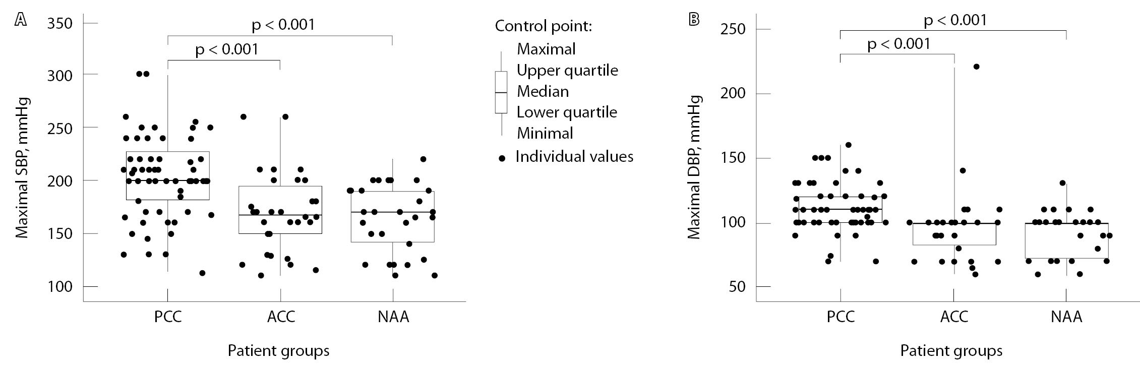 АГ зафиксирована у большинства пациентов с различными опухолями надпочечников: при ФХЦ – у 58/63 (92,1%), при АКР – у 23/30 (76,7%), при ГНОН – у 24/30 (80%); различий частоты АГ в группах не отмечено (р = 0,089). Показатели САД и ДАД оказались статистически значимо выше в группе ФХЦ как при множественном сравнении, так и при попарном сравнении с группами АКР и ГНОН (р < 0,001 при критическом уровне значимости < 0,0167 для обоих сравнений), при этом показатели в группах АКР и ГНОН не отличались (рис. 2).