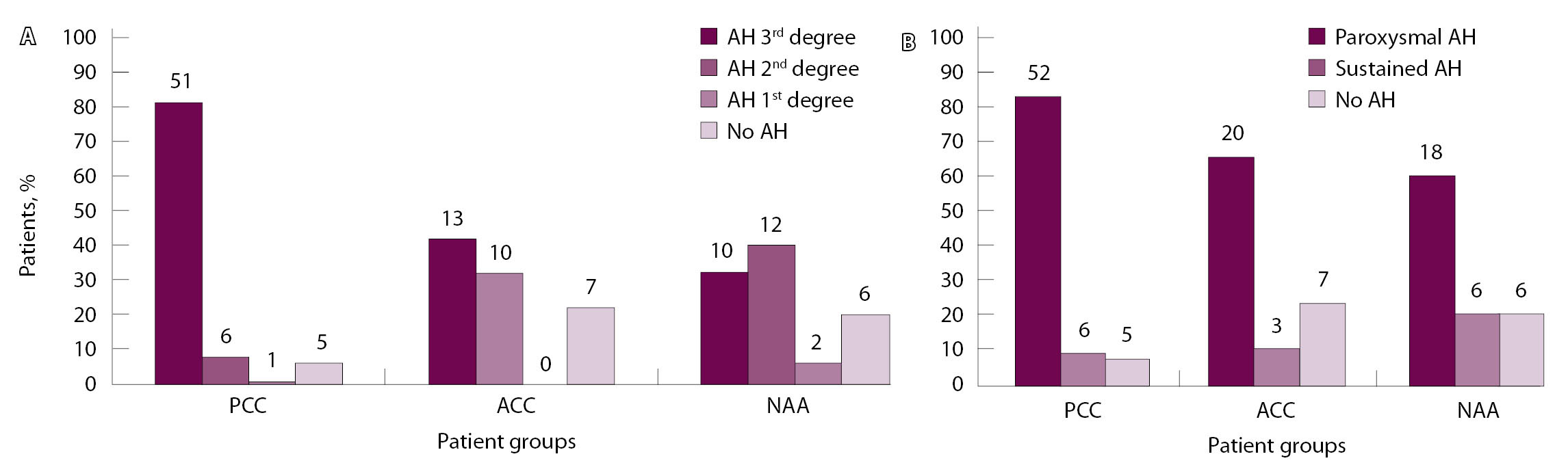 Доля пациентов с АГ 3-й степени также была наибольшей в группе ФХЦ как при множественном (p < 0,001), так и при попарном сравнении с группами АКР и ГНОН (р = 0,004 для обоих сравнений); различий между группами АКР и ГНОН не установлено (рис. 3А). У пациентов с неопределенным или злокачественным КТ-фенотипом опухоли надпочечника и АГ 3-й степени оказались высокие шансы выявить ФХЦ, а не АКР или ГНОН (ОШ 5,978, 95% ДИ 2,620–13,640; р < 0,001). Во всех группах преобладали пациенты с кризовым течением АГ (рис. 3Б), доля которых не имела статистически значимых отличий при множественном сравнении (p = 0,222).