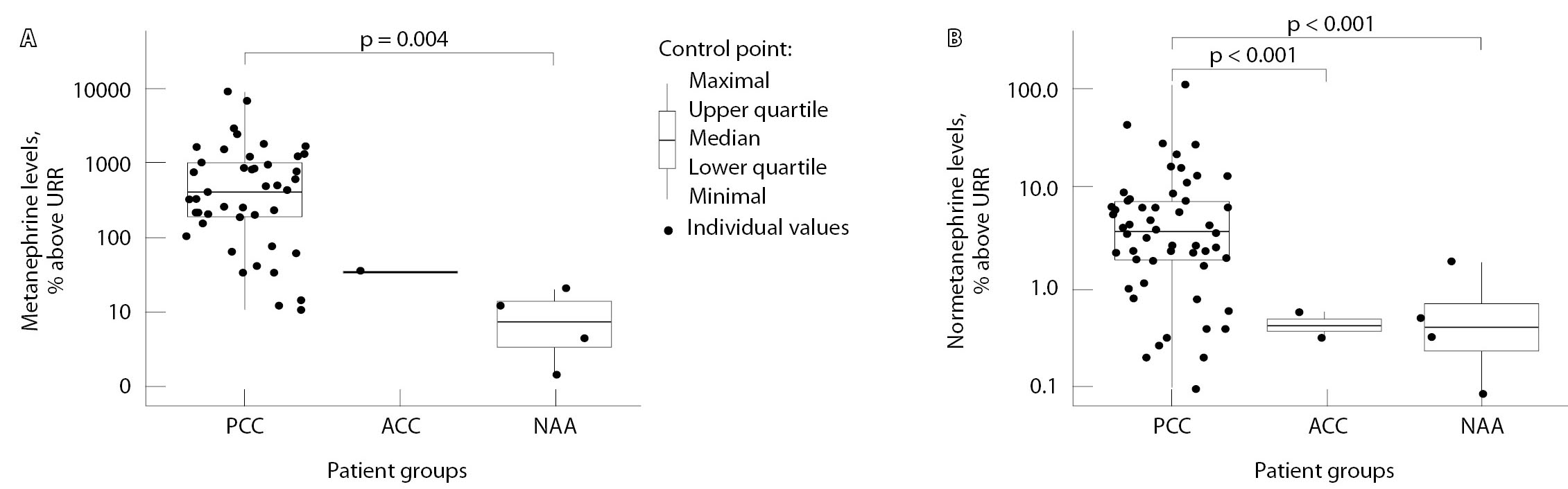 Уровень экскреции свободных метанефринов и норметанефринов в суточной моче определяли методом высокоэффективной жидкостной хроматографии с тандемной масс-спектрометрией, референсные значения составили: метанефрины– менее 320 мкг/сут, норметанефрины – менее 390 мкг/сут. Процент повышения метанефринов и норметанефринов рассчитывали по формуле: