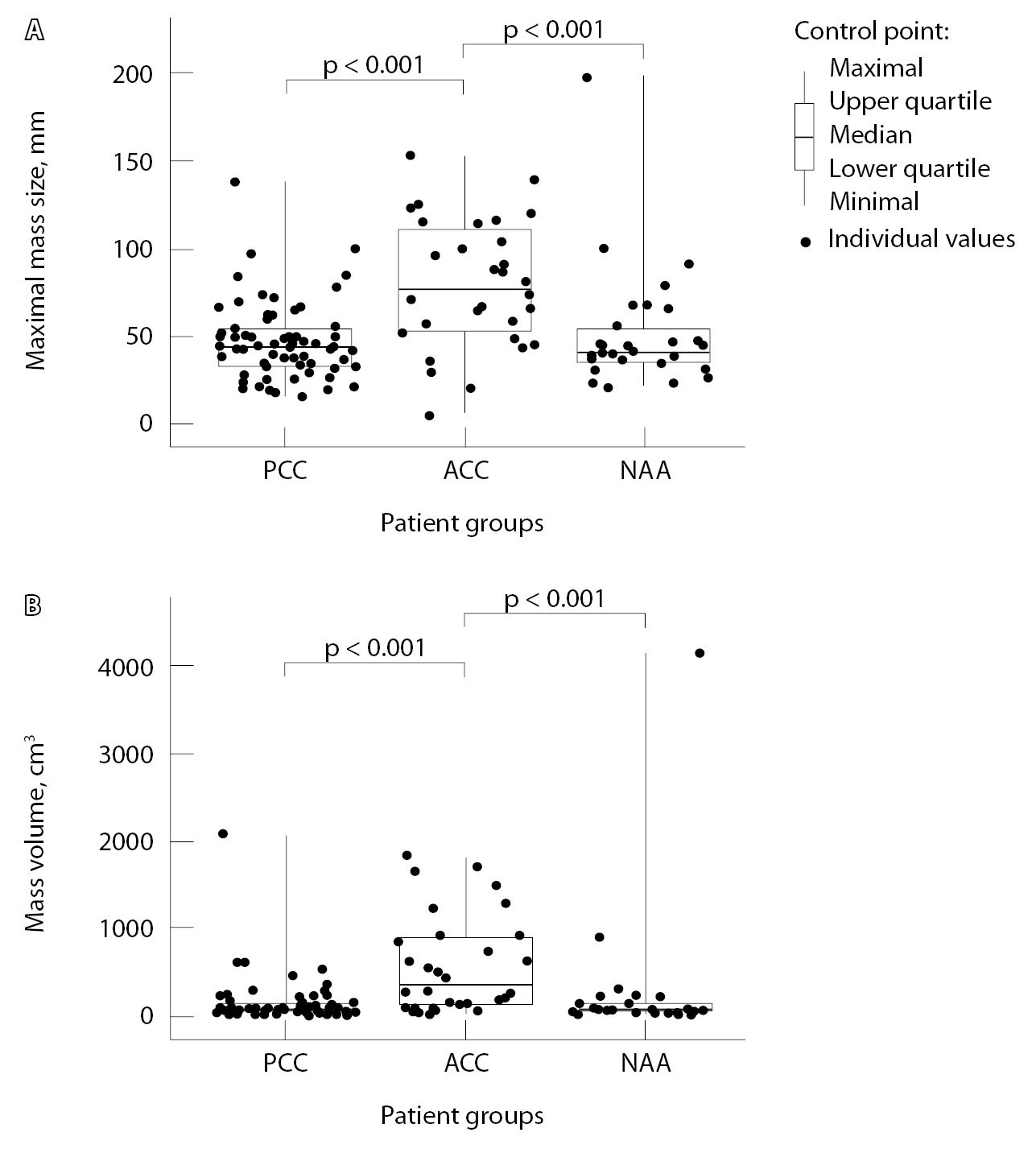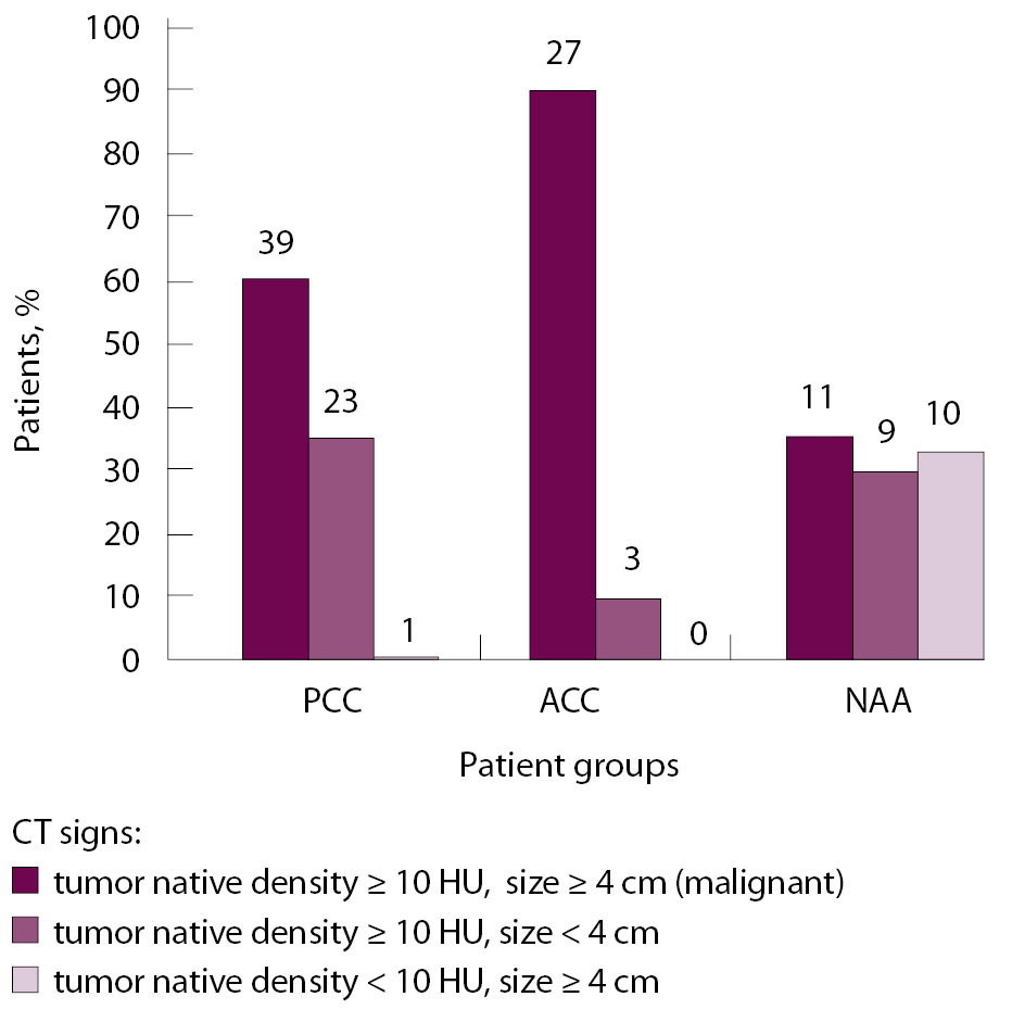 Results: Paroxysmal type of arterial hypertension (AH) was common across all groups; its presence did not aid discrimination. AH grade 3, however, prevailed in the patients with PCC only. Patients with an adrenal mass and AH grade 3 had the high probability of PCC presence (odds ratio, OR: 5.978, 95% confidence interval, CI [2.620–13.640]; p < 0.001). AH grade distribution was similar in the ACC and NAA groups. Headache (57.1%), palpitations (48.3%) and a history of peptic ulcer disease (25.4%) were also characteristic of PCC. In contrast, generalized weakness and lumbar pain predominated in ACC (63.3% and 60%, respectively) and NAA (56.7% and 73.3%). Tumors with native density of ≥ 10 HU and size > 4 cm (the malignant CT phenotype) were found in 90% (27/30) of ACC, 62% (39/63) of PCC, and 36.7% (11/30) of NAA cases. This CT appearance detected a malignant lesion (PCC or ACC) with 71% sensitivity and 63% specificity, while the chance to find NAA was low (OR: 0.237, 95% CI [0.097–0.555]; р < 0.001). Tumors with native density ≥ 10 HU and tumor size of < 4 cm were found in similar proportions in PCC (36.5%, 23/63) and NAA (30%, 9/30) groups, indicating a low probability of ACC (OR: 0.212, 95% CI [0.048–0.659]; р = 0.016) and focusing the differential diagnosis on PCC versus NAA. Tumors with native density < 10 HU and size ≥ 4 cm were rare in PCC (1/63, 1.6%) and absent in ACC, yet presented in 10/30 (33.3%) NAA cases. This CT phenotype is associated with low risk of malignancy (OR: 0.022, 95% CI [0.001–0.123]; р < 0.001), although insensitive (33%), it had a specificity of 98.9% for benign NAA.