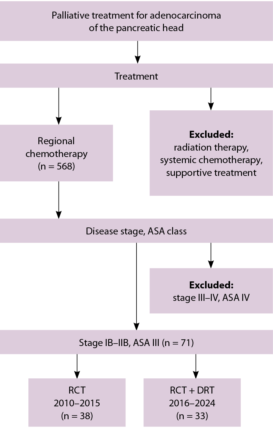 С 2010 по 2024 г. в ФГБУ «РНЦРХТ им. ак. А.М. Гранова» Минздрава России паллиативную РХТ провели 568 больным РПЖ. В ретроспективный анализ включали данные пациентов с резектабельной протоковой аденокарциномой головки поджелудочной железы, физический статус которых по классификации Американского общества анестезиологов (англ. American Society of Anesthesiologist, ASA) был оценен как ASA III (пациенты с тяжелым системным заболеванием, неоперабельные) и которым была проведена РХТ в монорежиме либо в комбинации с конформной ЛТ. Катамнез отслежен по состоянию на 01.02.2025.